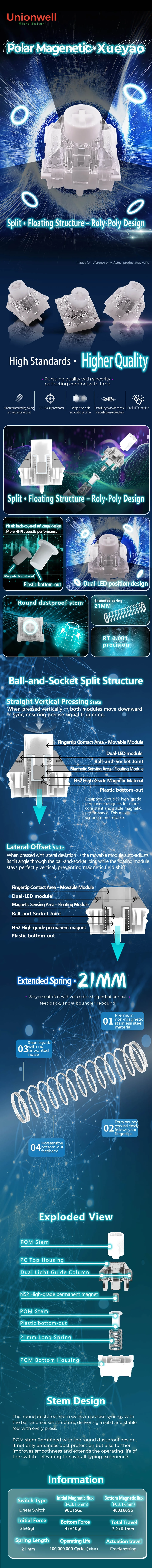 Unionwell Xueyao interruptor magnético Snow Shine interruptor RGB lineal para teclado mecánico magnético resorte largo prelubricado 45g 480Gs
