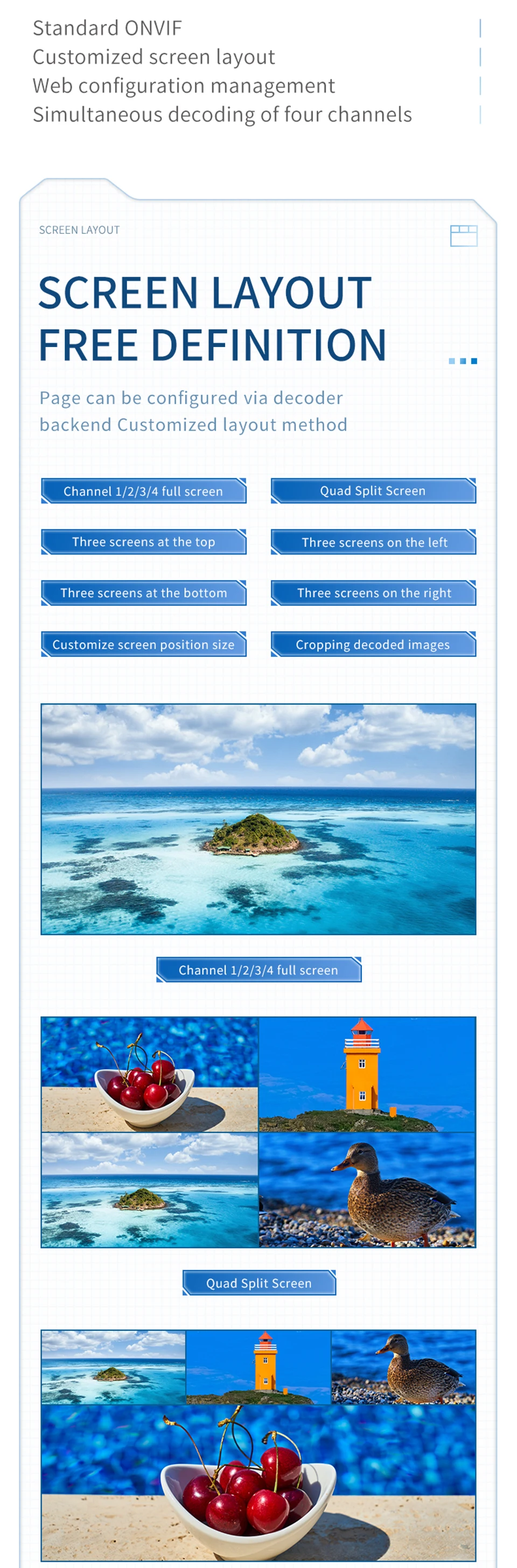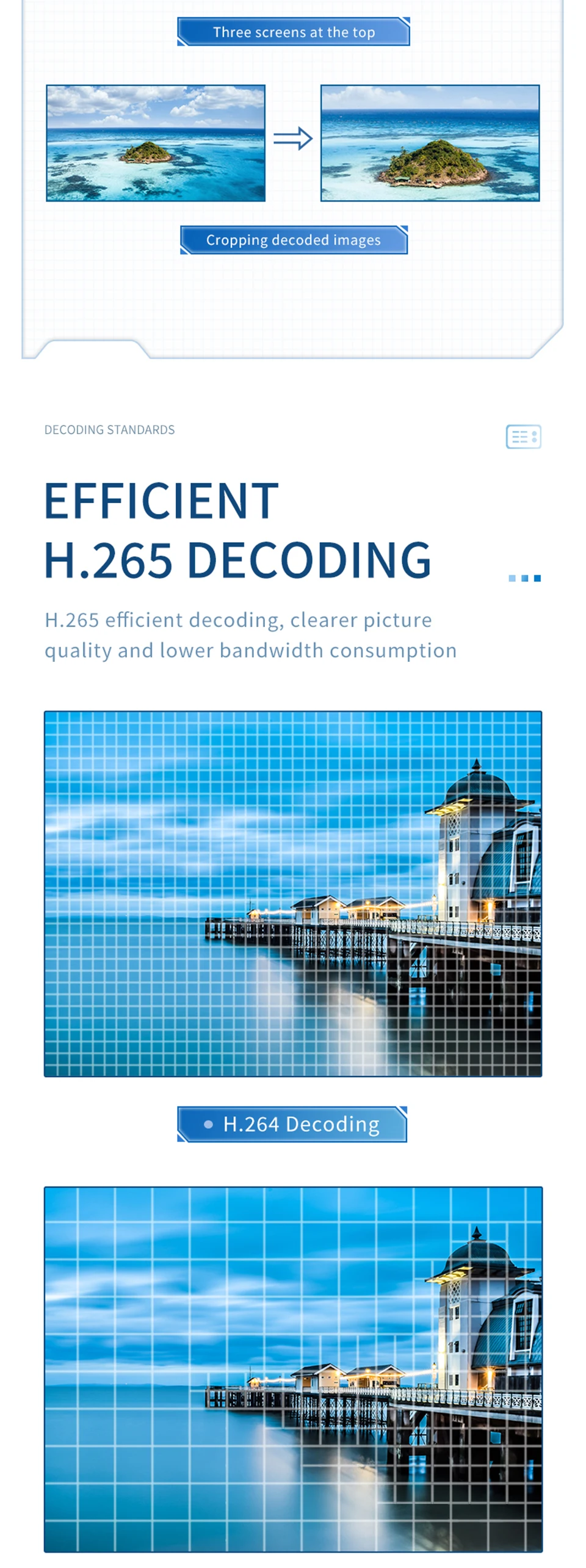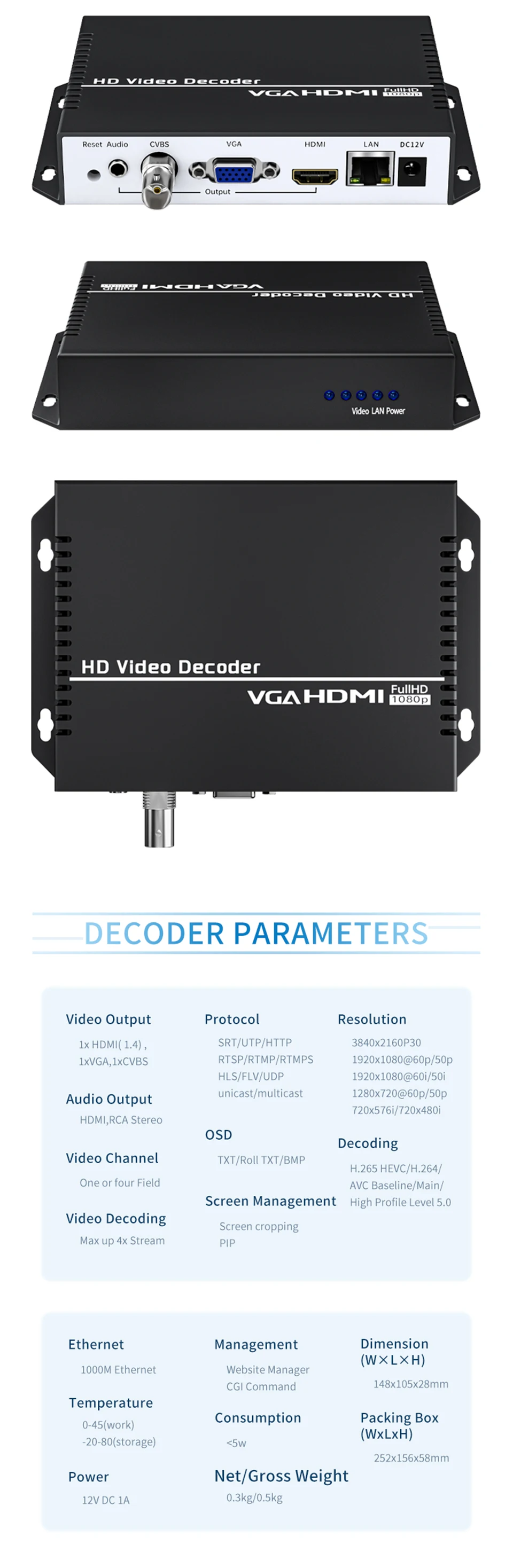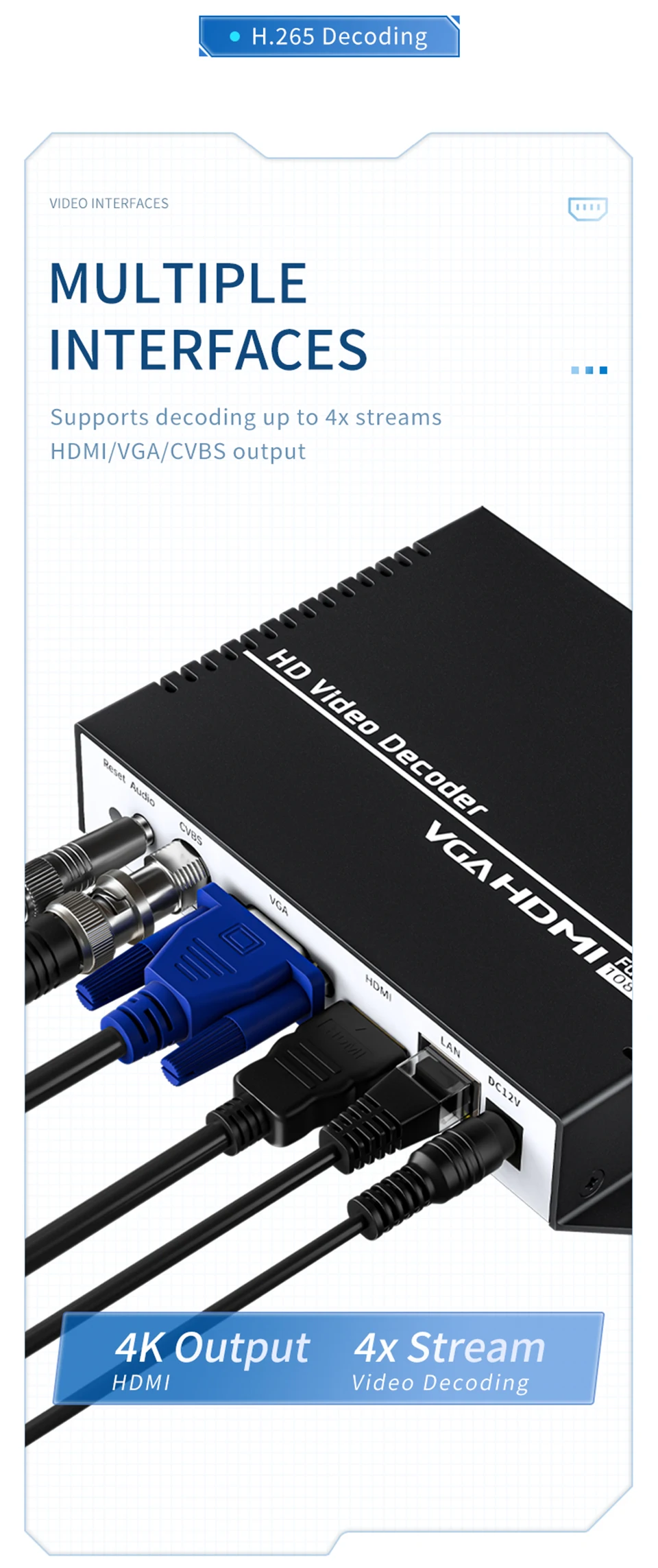 * Compatible con decodificación H.265/H.264 * Compatible con salida VGA * Compatible con salida HDMI 2160p30 * Compatible con protocolo SRT, RTSP, UDP, RTMP, HTTP * Compatible con protocolo Push SRT/RTMP * Compatible con PIP/Crop/OSD * Personalizable