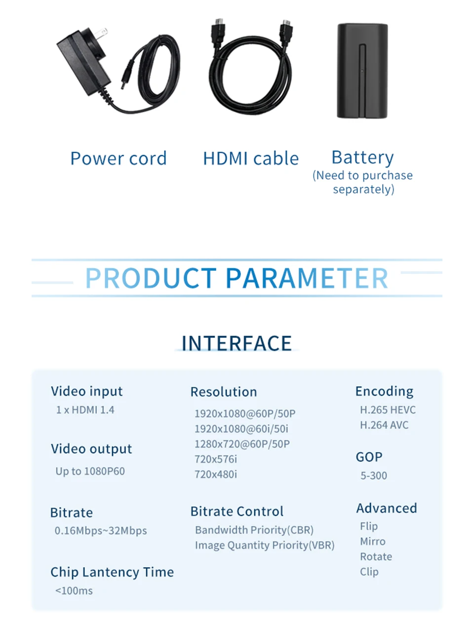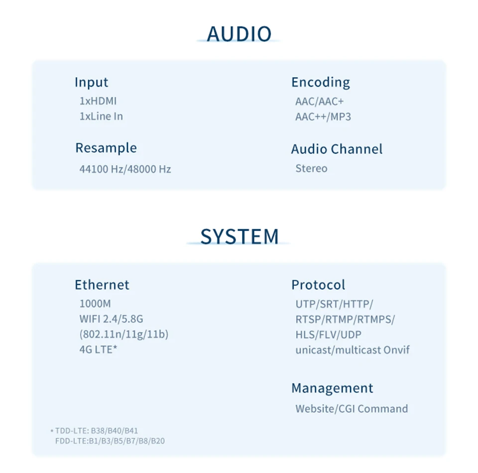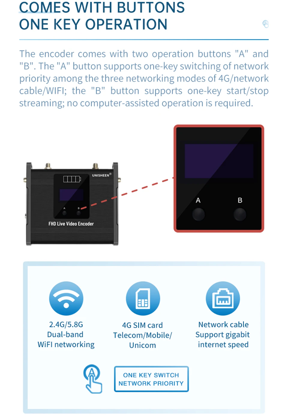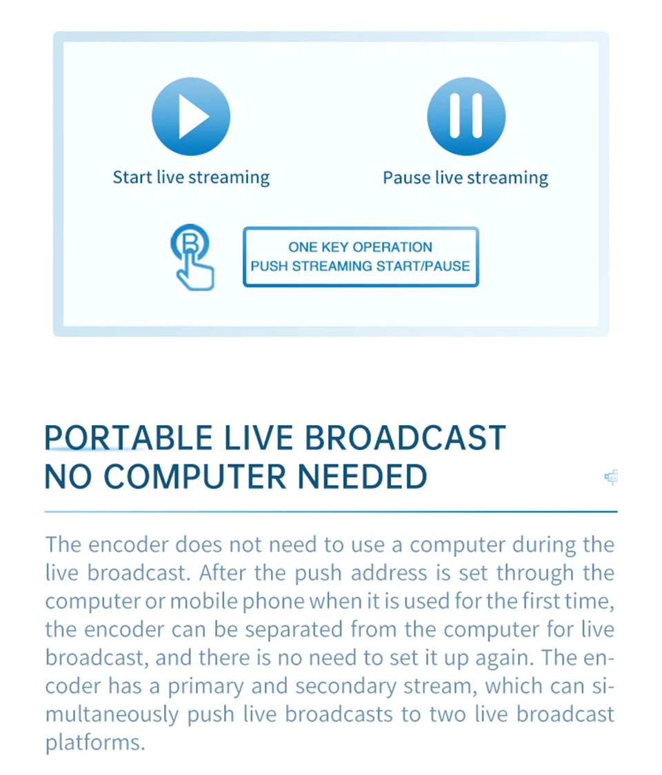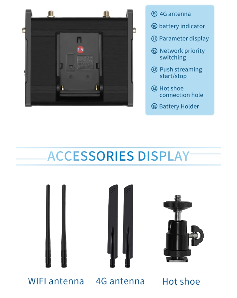 *Soporta 4G/LTE*Soporta batería*Soporta una tecla para iniciar/detener el flujo*Soporta protocolo RTMPS/SRT