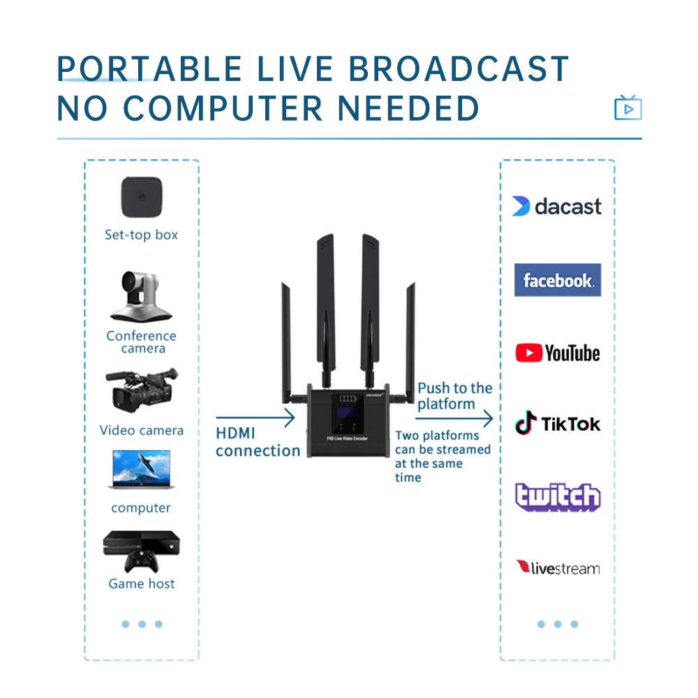 Comprar UNISHEEN H264 H265 WIFI transmisor Ip RTMPS transmisión en vivo inalámbrico RTSP SRT 4G LTE HDMI SDI codificador de vídeo transmisión en vivo