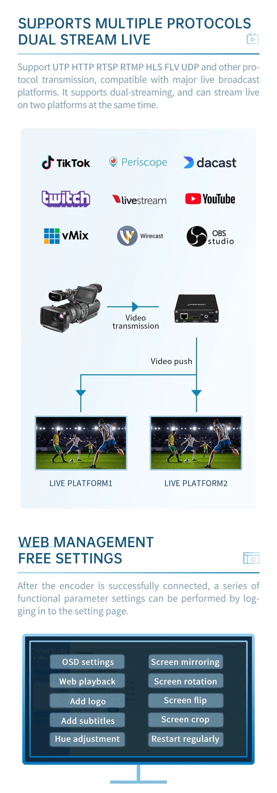 ¡Fácil de transmitir en Facebook y Youtube al mismo tiempo!
