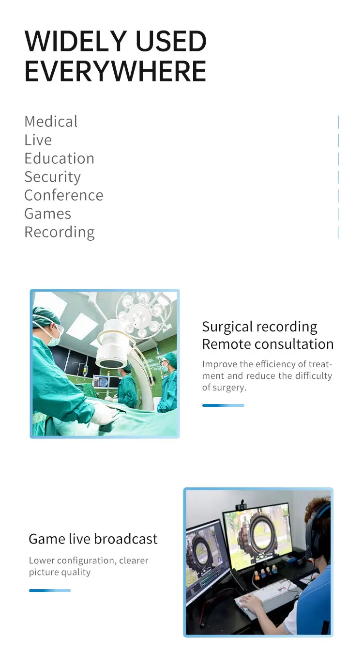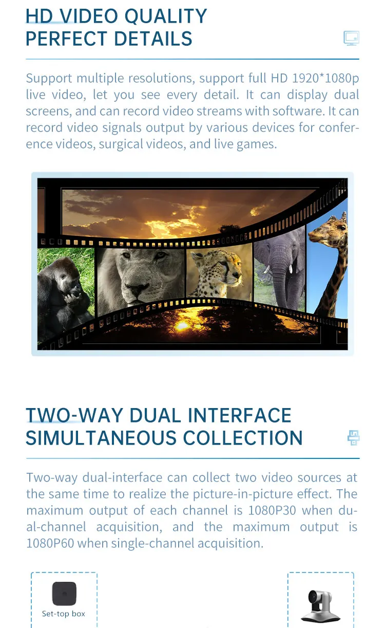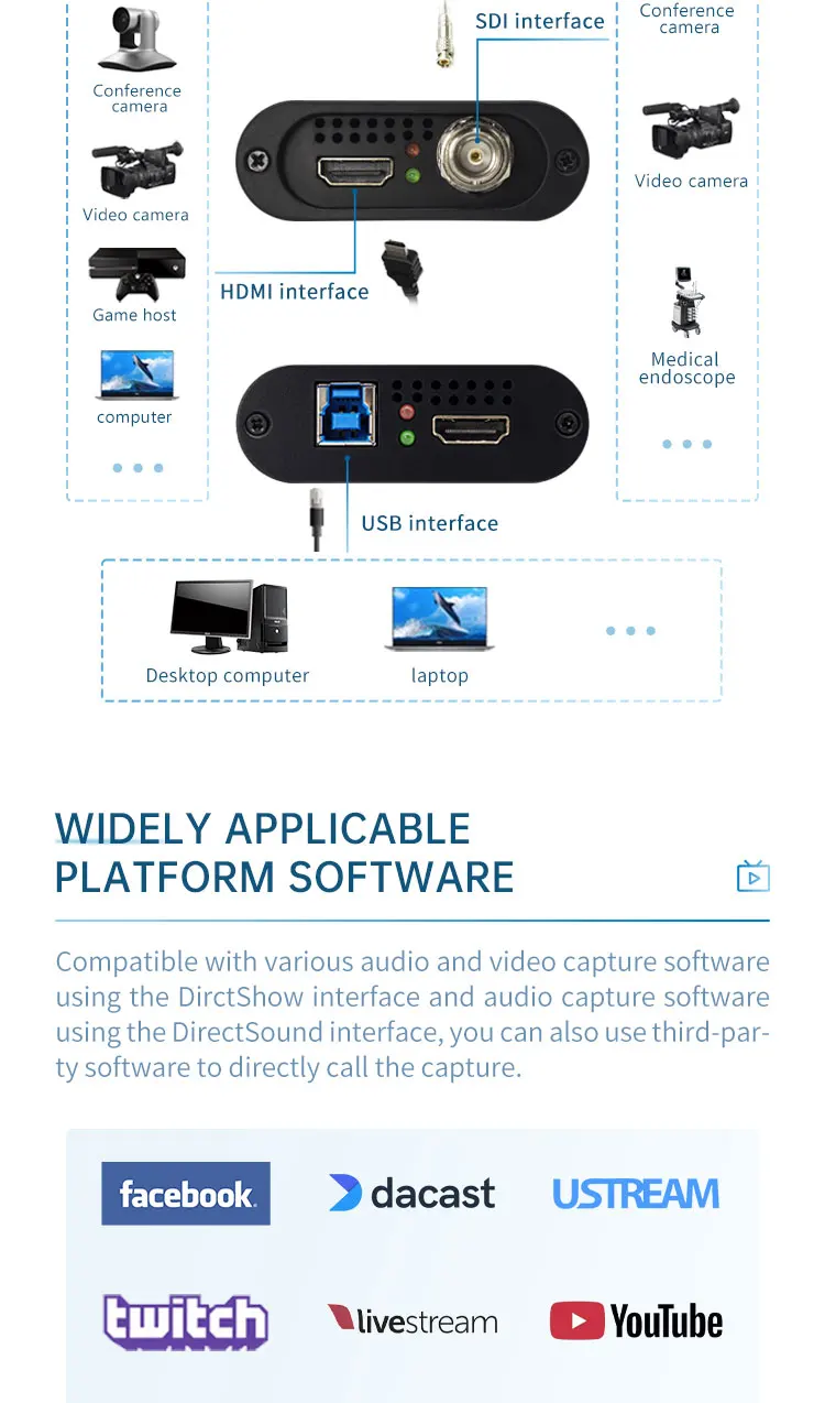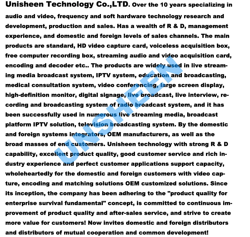 1. Conecte múltiples dongles a una máquina2. Habilite la conversión arriba/abajo de la resolución de video, la velocidad de fotogramas y la frecuencia de muestreo de audio3. Admite brillo, contraste, tono, saturación y otras funciones de ajuste de pantalla4. La captura de vídeo HDMI cumple con el estándar UVC, admite salida de vídeo YUV 4:2:2 (YUY2) o RGB 4:4:4 (RGB24).5. La captura de vídeo HDMI cumple con el estándar UAC y la salida de audio estéreo PCM de 48KHz.6. El motor de procesamiento de vídeo se puede actualizar a través del firmware sin cambiar el hardware.7. Detecta y desentrelaza automáticamente las señales8. Fiable y estable: memoria integrada DDR2 de 64MB, puede realizar eficazmente el búfer de fotogramas de vídeo y el control de flujo de transferencia USB para evitar interrupciones o imágenes de error cuando el ancho de banda de transmisión USB está ocupado.Pasar a través de 7x24h pruebas continuas de alta carga en altas y bajas temperaturas (0-50 grados)9. Fácil de usar: no es necesario instalar controladores en Windows, Linux y OS X, plug and play real.Compatibilidad:1. Compatible con varios chipsets USB 3,0 (Intel, Renesas, ASMedia, Fresco Logic), compatible con USB 3,0 expandido a través de PCIe Gen1.1 X12. Compatible con USB 2,03. Sistemas operativos compatibles: Windows (7, 8, 8,1), Linux (versión del núcleo 2.6.38 y Superior), OS X (10,8 y superior)4. Admite API, como Windows: DirectShow, DirectSound, Linux: V4L2, ALSA, OS X: QuickTime5. Software compatible que incluye Windows Media Encoder (Windows), Adobe Flash Media Live Encoder (Windows, OS X), Real Producer Plus (Windows), VLC (Windows, OS X, Linux), quickTime Broadcaster (OS X), QuickTime Player (OS X), Wirecast (Windows, OS X), etc.Excelente procesamiento de vídeo:1. Admite entrada de vídeo de hasta 1920x1200 p60 ()2. La salida de vídeo admite hasta 1920x1200p60 en YUY23. La salida de vídeo admite hasta 1920x1200p60 en RGB244. El proceso de vídeo y audio se realiza mediante el dongle y no ocupará la CPU.Especificaciones:
