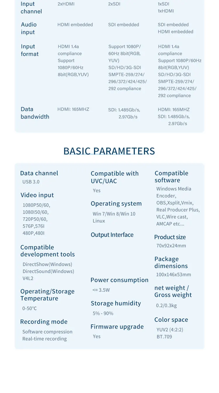 Conformidad HDMI 1.4a ,Soporte 1080P/60HZ 8-bit,(YUV)SD/HD/3G-SDI,Conformidad con los códigos:/274/296/372/424/425/292