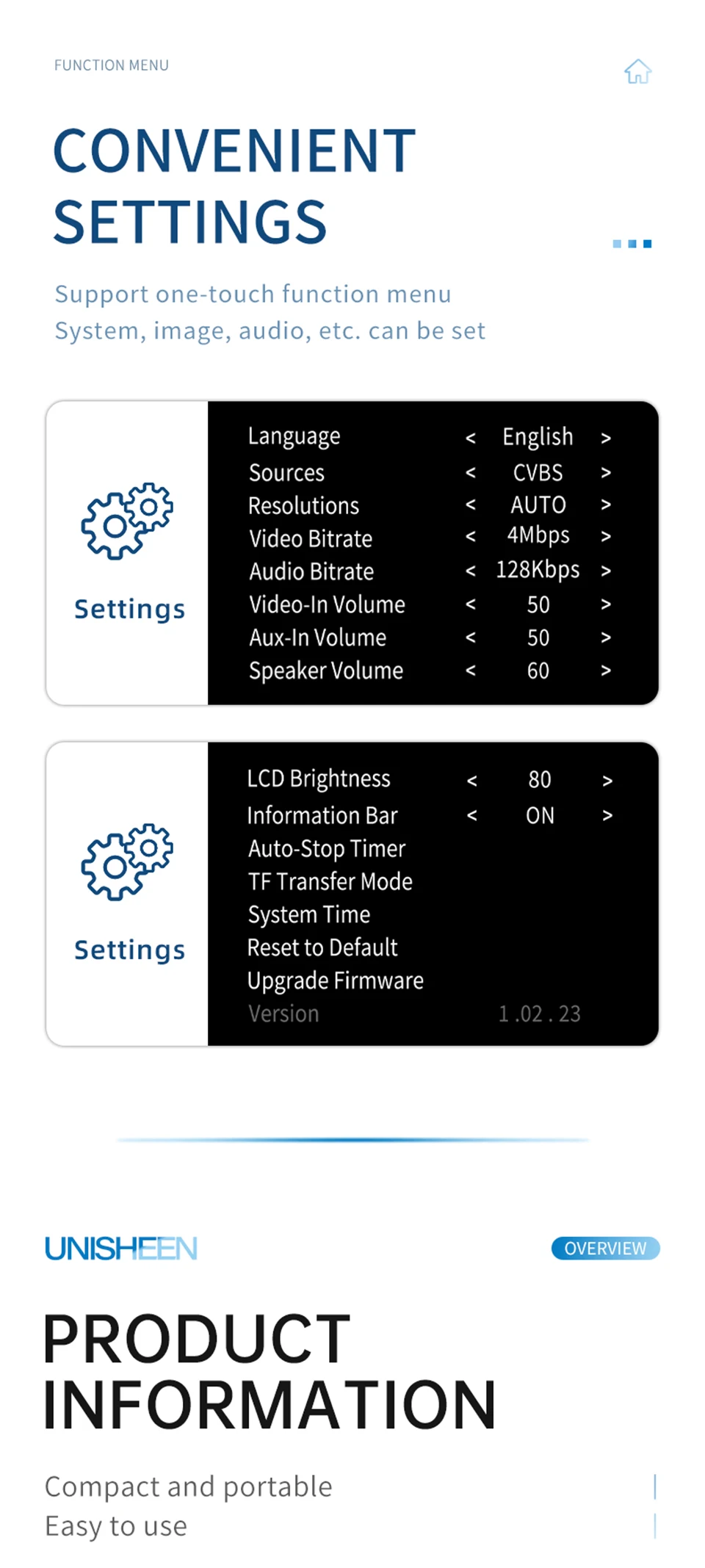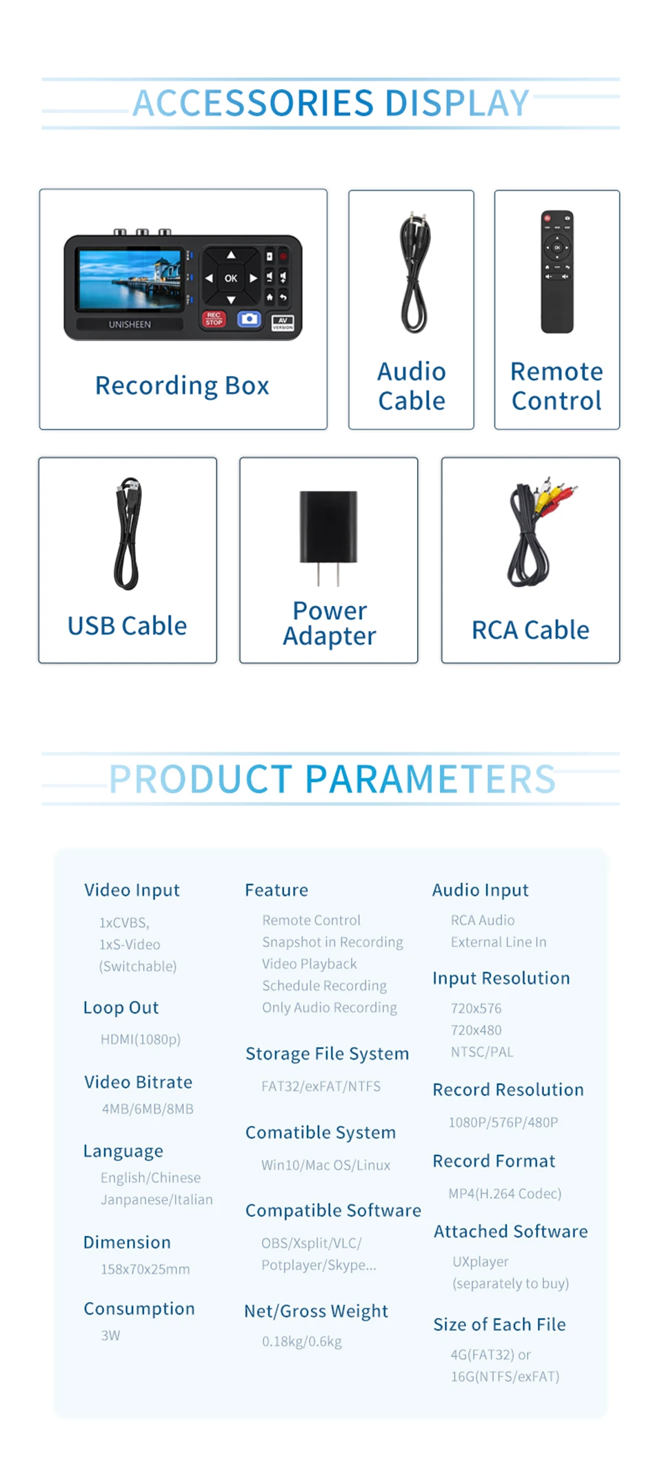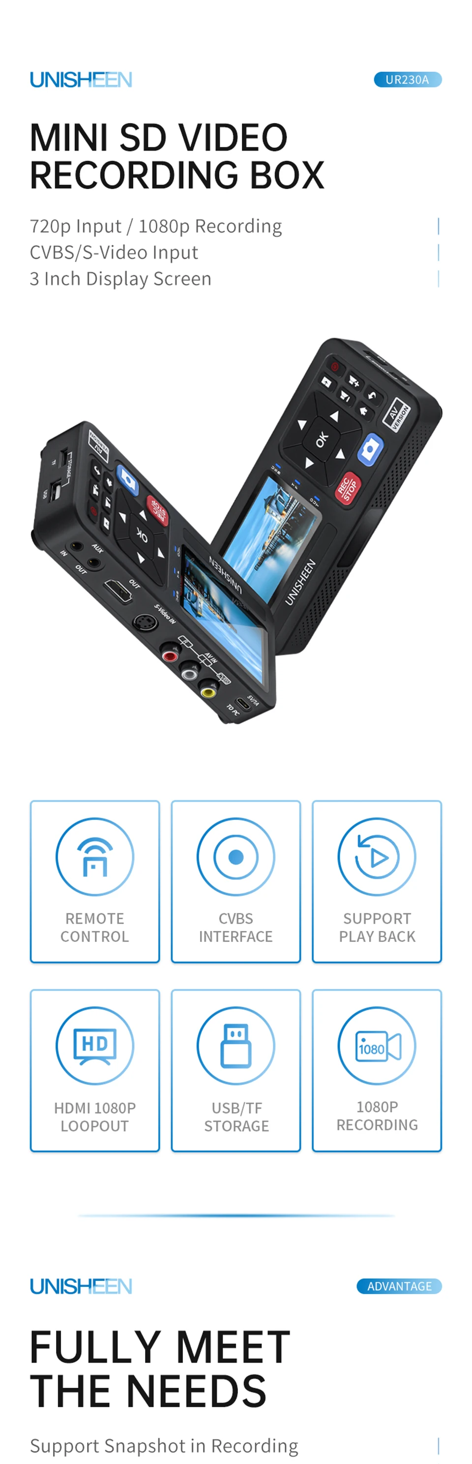* CVBS/Entrada de video* Salida de bucle HDMI 1080p* Grabación en 480p/576/1080p* Solo admite grabación de audio* Admite instantáneas en grabación* Programar grabación* Unidad USB flash o almacenamiento TF* Admite reproducción* Control remoto