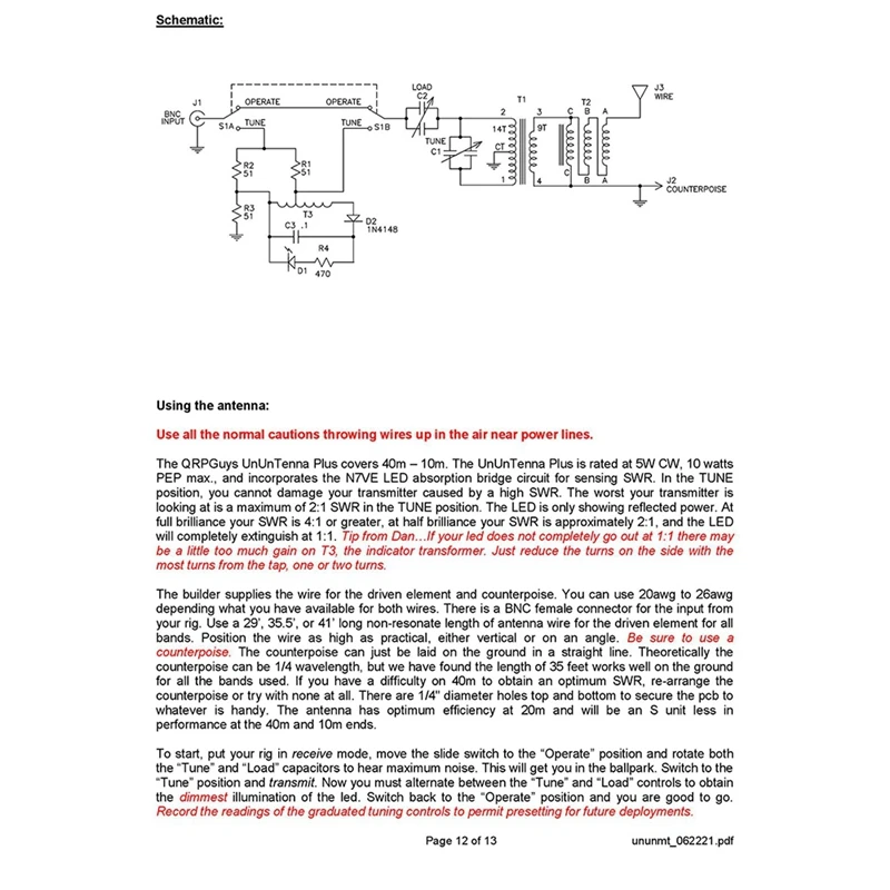 La sección del sintonizador se basa en el circuito diseñado por Charlie Lofgren, W6JJZ, que también incorpora el indicador LED Dan Tayloe (N7VE) SWR. El circuito fue diseñado por primera vez para el Norcal QRP Club. Tiene una potencia de 10 vatios PEP y utiliza un balun de voltaje integral de 9: 1 que combina su entrada de impedancia desequilibrada de 50 ohmios con un cable largo desequilibrado de impedancia de 450 ohmios.