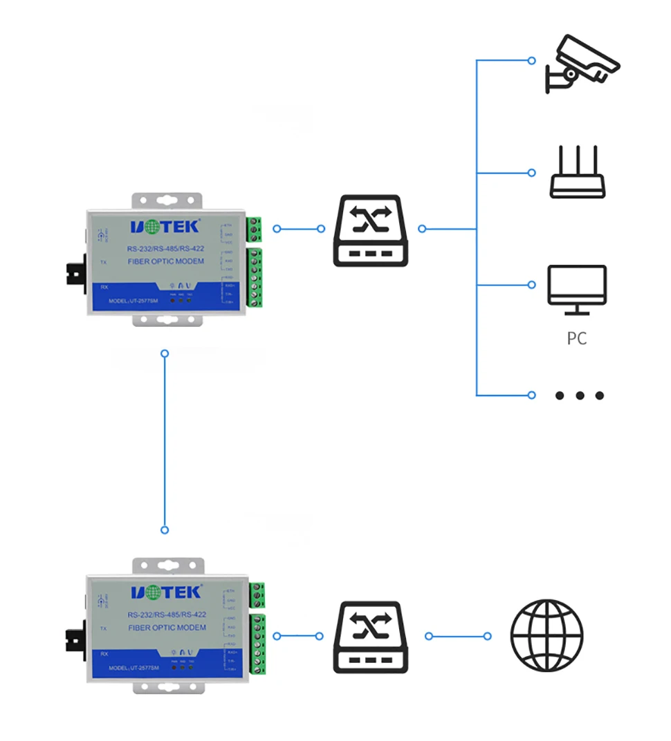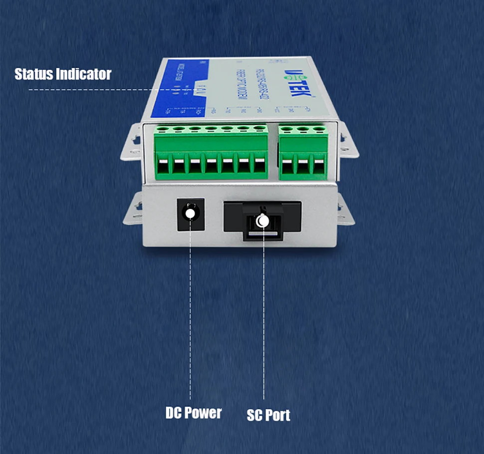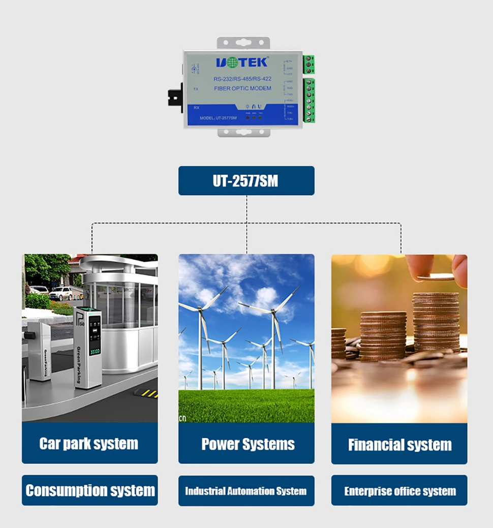 El módem de fibra óptica UT-2577SM admite comunicación asíncrona RS-232/485/422. Es la mejor opción para conectar la UNIDAD terminal REMOTA (RTU) con el HOST o el controlador SCADA. Admite protocolos asíncronos RS-232/485/422; Se puede mezclar y combinar para usar 2 puertos RS-232, RS-485 o RS-422, y admite 2 cables (semidúplex) RS-485 y 4 cables (dúplex completo) Modo RS-422.
