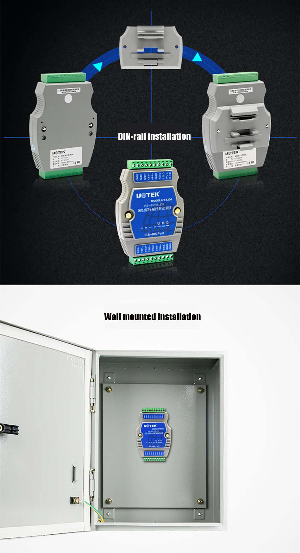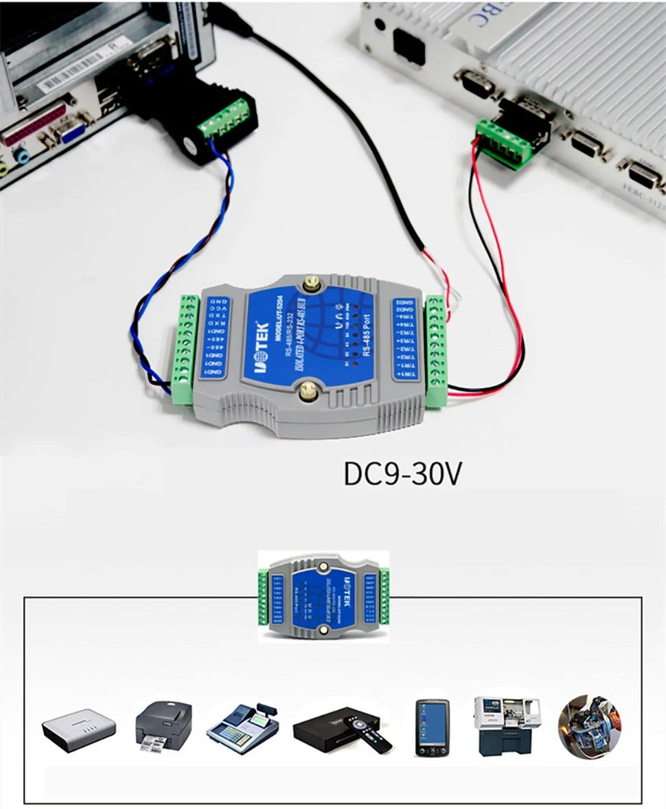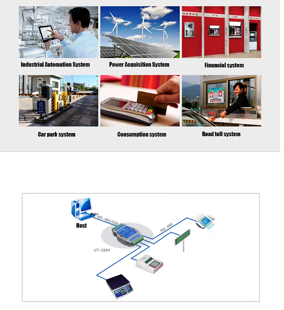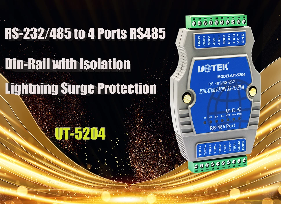 Utilizado en sistemas de peaje de carreteras, sistemas de monitoreo de carreteras y sistemas de energía. UT-5204 HUB DE RS-485 admite conexión de BUS star RS-485. Cada puerto admite cortocircuito, protección de circuito abierto, aislamiento optoelectrónico de 2.500 V. El usuario puede cambiar fácilmente la estructura del BUS de RS-485,