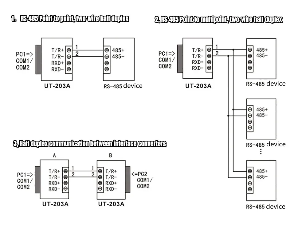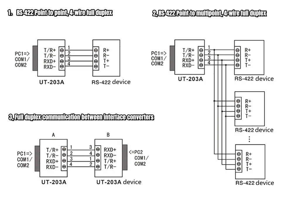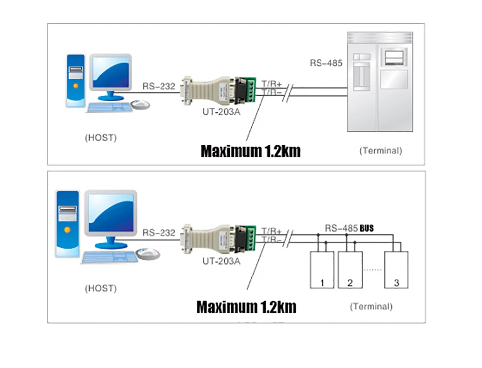 Señales diferenciales de RS-485 o de RS-422. La distancia de transmisión de la Comunicación de la RS-232 se puede extender a 1,2 km.
