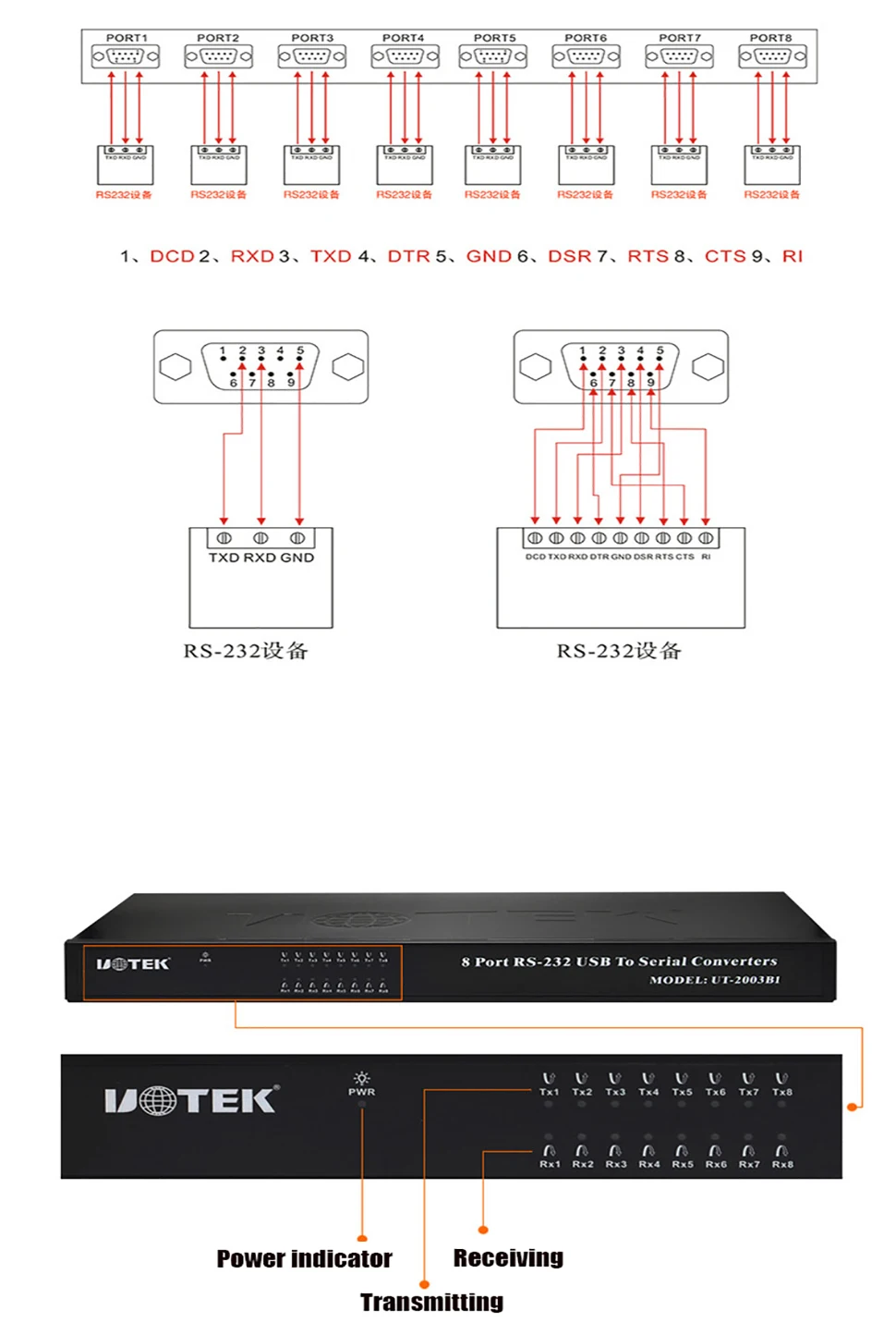 UT-2003B proporciona conexión para comunicación punto a punto.La tasa de baudios puede ser 300-921,6 Kbps.Los indicadores de flujo de potencia y datos.