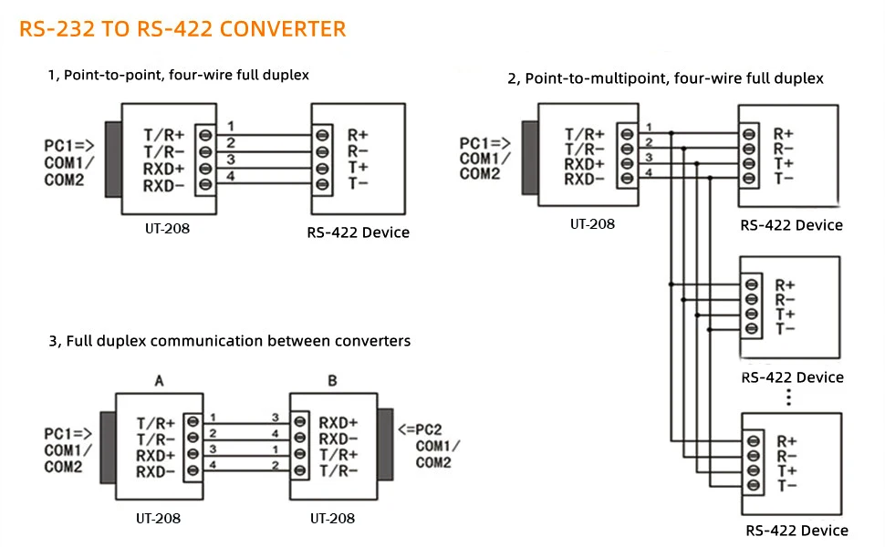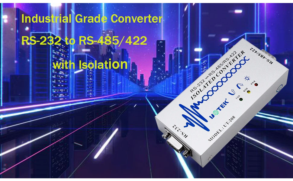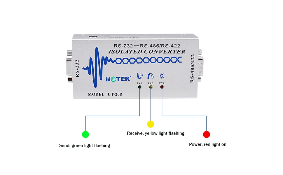 UT-208 es un convertidor con aislamiento optoelectrónico. Cumple con los estándares RS-232C, RS422 y RS-485; Convierte la señal de un solo lado RS-232 en una señal diferencial equilibrada RS-422 o RS-485.