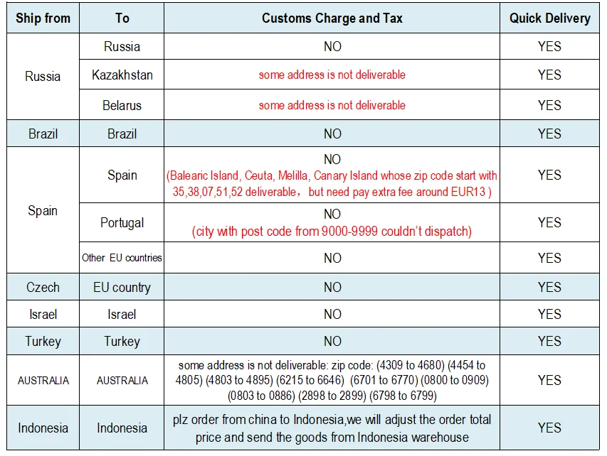 1.¡Todos los costos de envío realizados en Aliexpress no incluyen recargo en área extendida! 2.Por favor verifique con UPS, FedEx, DHL, TNT, DPEX, etc.para confirmar si tu ciudad (código postal) necesita recargo por área extendida!! 3.Los derechos de aduana y impuestos NO están incluidos en el costo de envío. 4.Escribe la dirección y el nombre en inglés, o el mensajería puede recusar el envío. 5.Ordene de China a Brasil, por favor deje tu número CPF en el pedido según sus aduanas lo necesitan. 6.UPS/FEDEX/TNT/DHL De China a CHILE/PERU 95% necesita pagar impuestos cuando recibir el paquete, los gastos de impuestos y de aduana están pagados por el comprador, no incluye nuestro precio, gracias (SHIP DE WAREHOUSE DE OVERSEA)