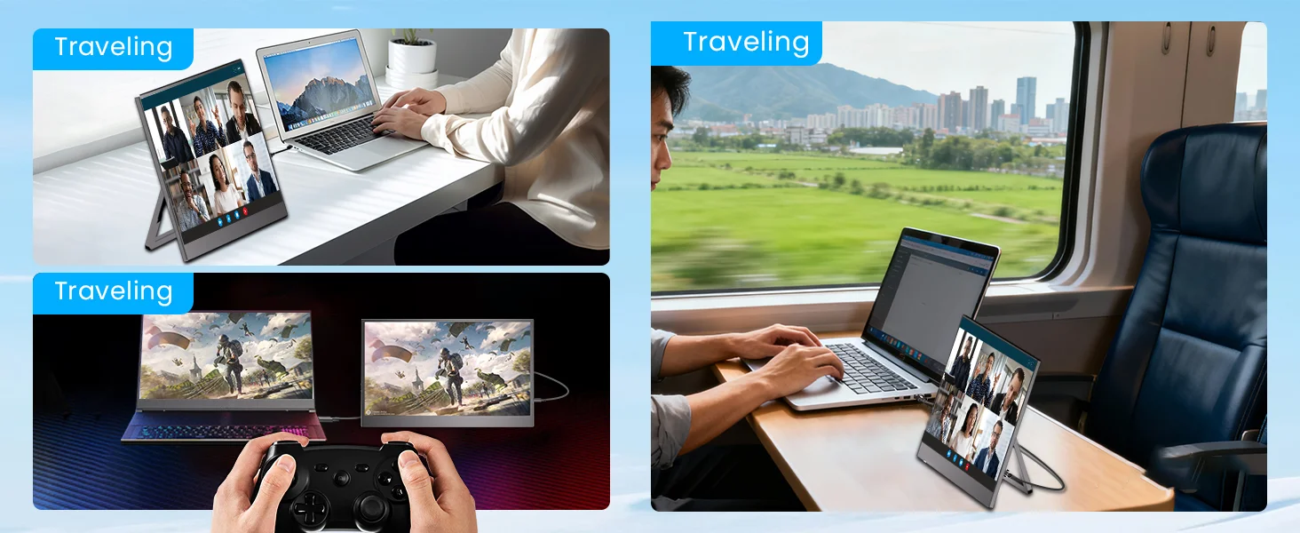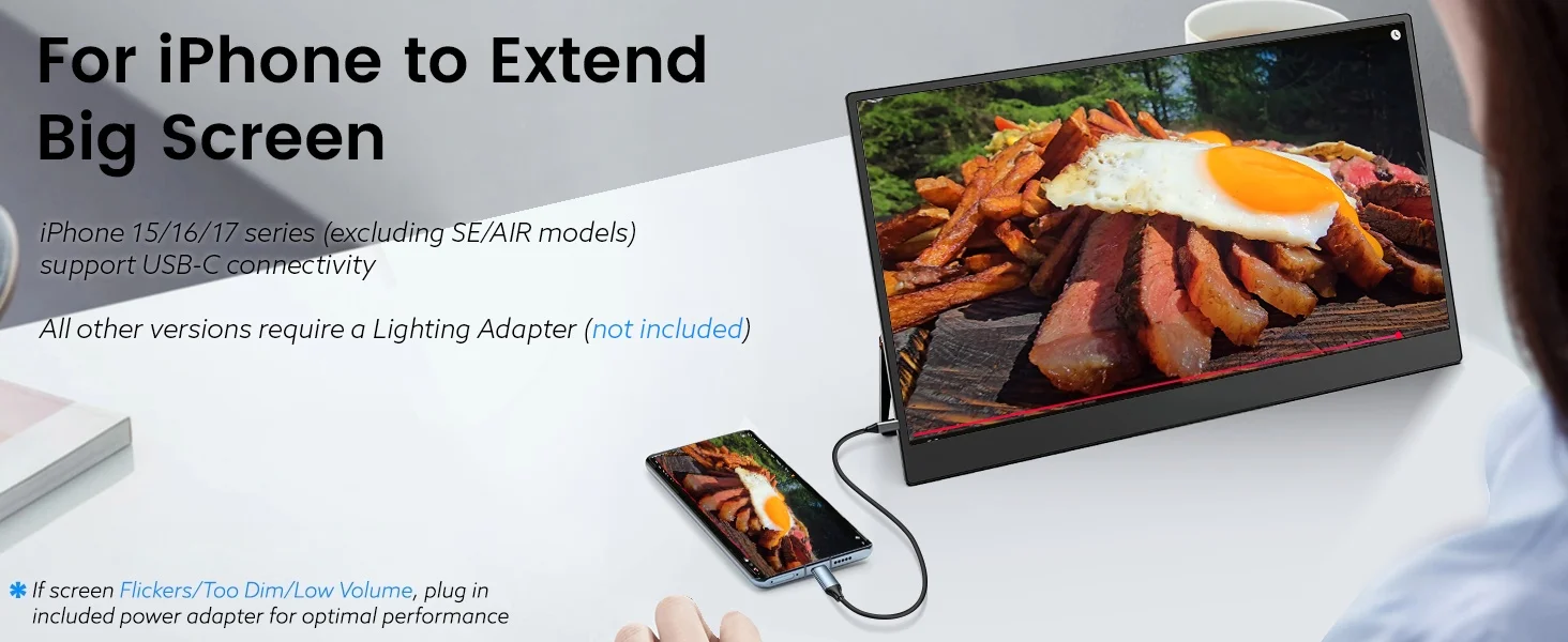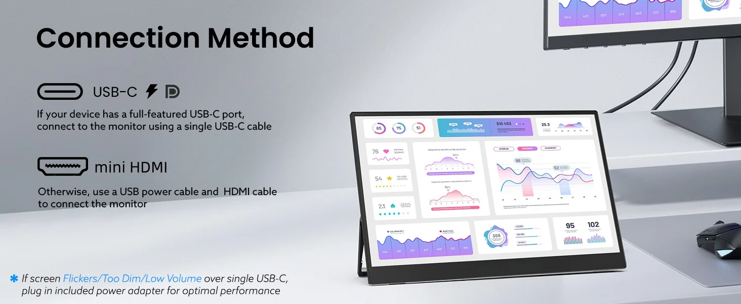 El monitor UPERFECT de 18,5 pulgadas cuenta con dos puertos tipo C 3.1 con todas las funciones y un puerto mini HDMI, lo que permite una conexión perfecta a teléfonos móviles, computadoras portátiles, computadoras de escritorio y otros dispositivos.