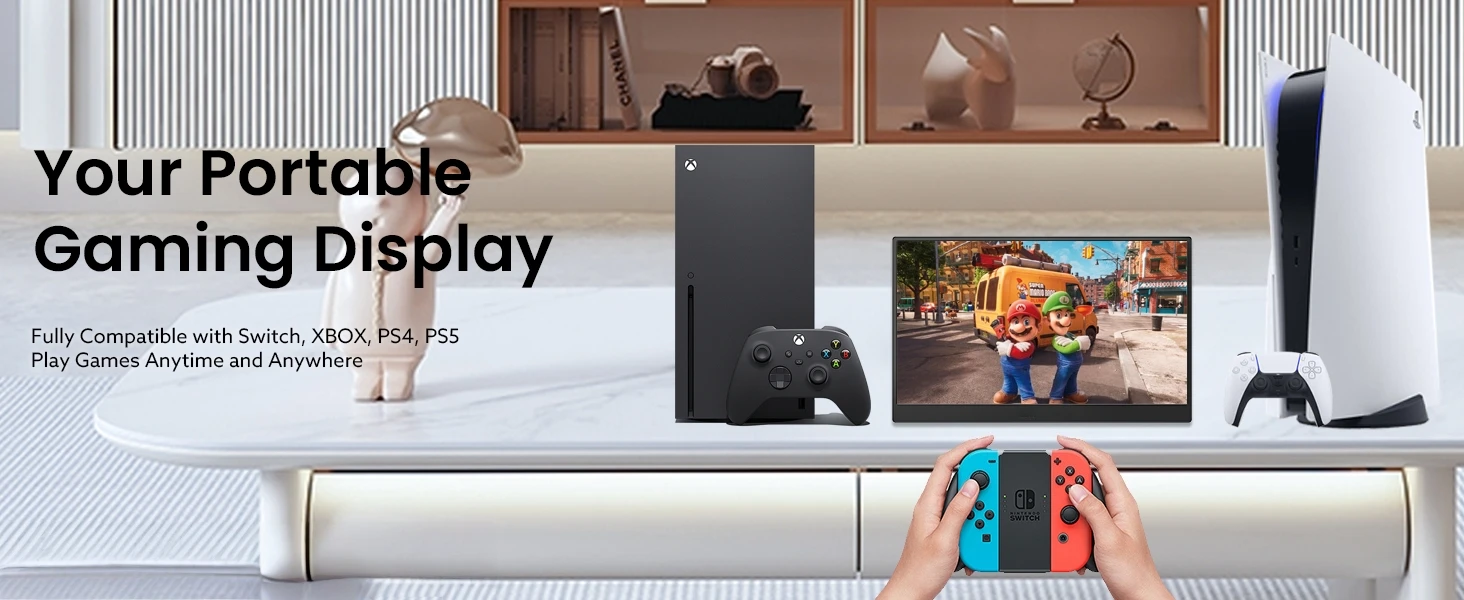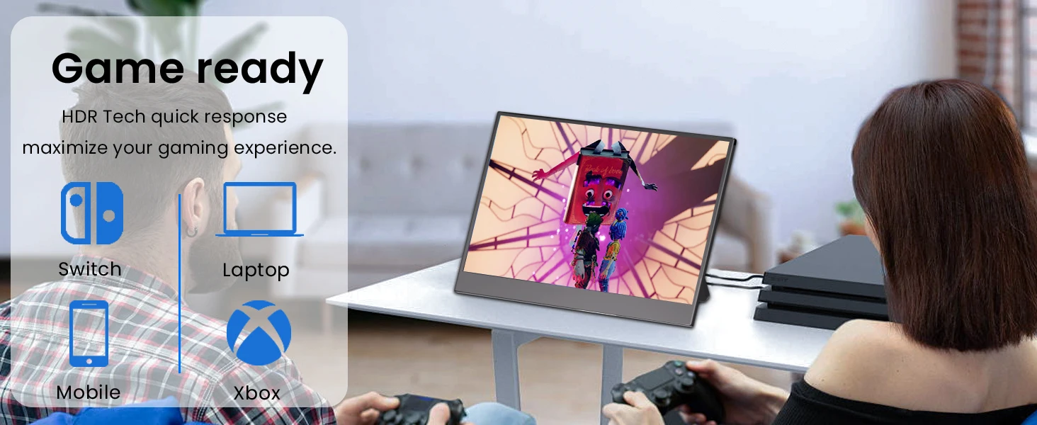 Conéctese a cualquier cosa que emita una señal de vídeo a través de HDMI o USB Type-C.El monitor portátil NexiGo es compatible con: computadora portátil/PC/Mac/cámaras/Playstation 5/Switch/Xbox/Apple/Android/¡y más!¡Un puerto USB adicional le permite conectar un teclado o un mouse!