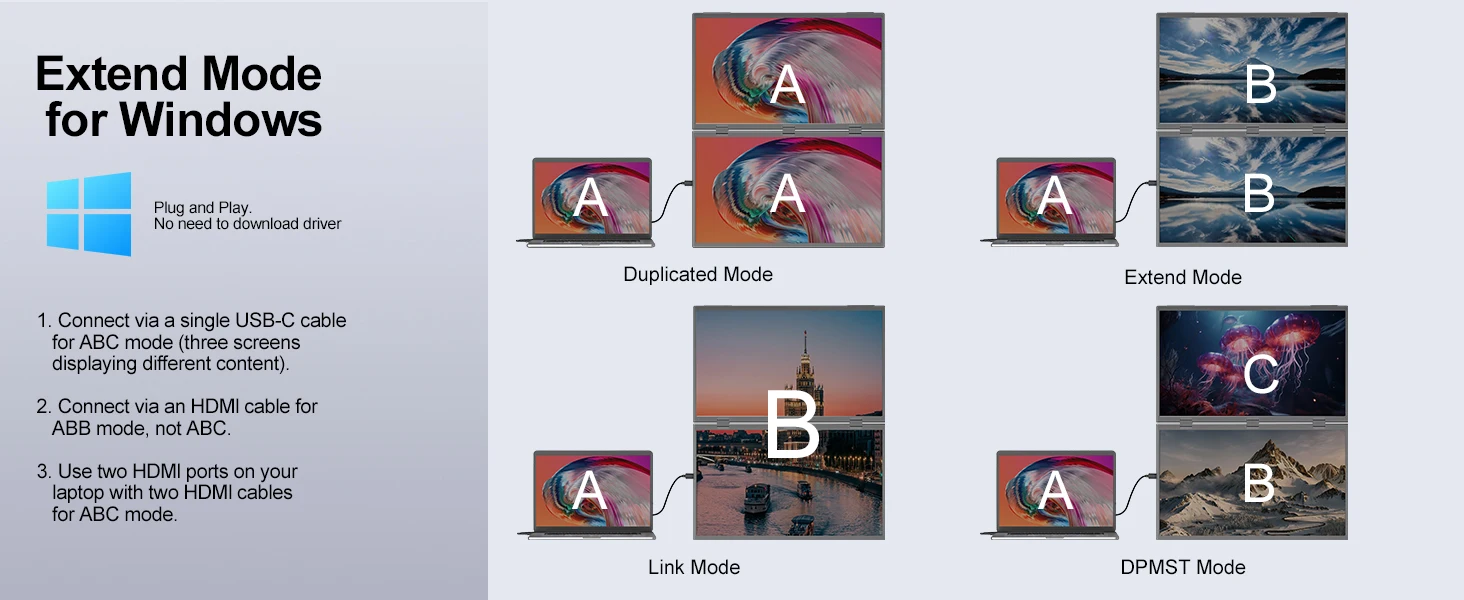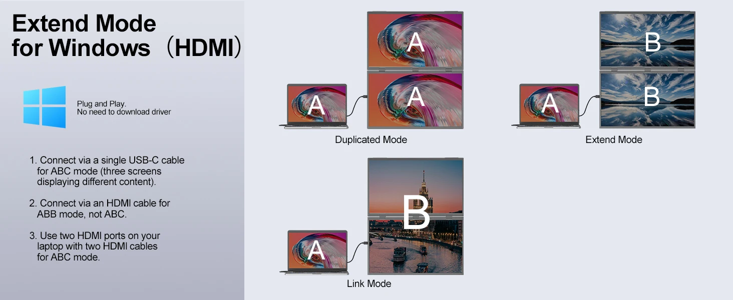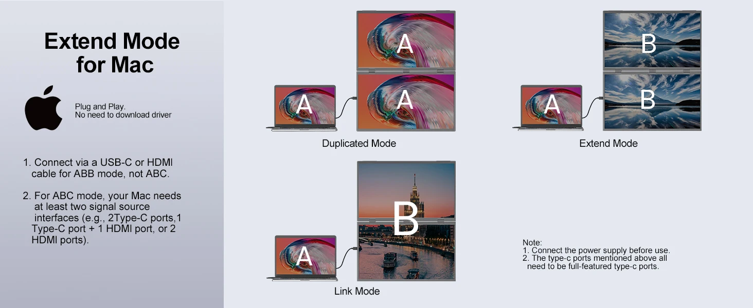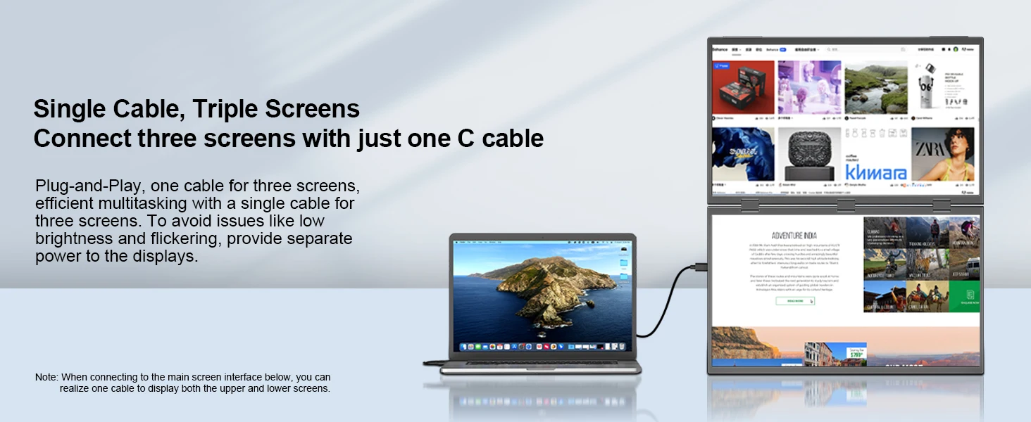 1. Cuando se conecte con un cable USB-C, asegúrese de que su dispositivo sea compatible con USB3.1./Thunderbolt 3. Si no, agregue un cable Mini HDMl a HDMl para la transmisión de señal.