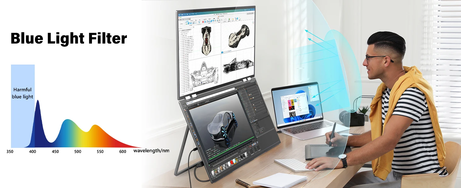 Reduce la dañina emisión de luz azul, alivia la fatiga visual y las molestias oculares y mantiene la comodidad y la relajación durante el uso prolongado.