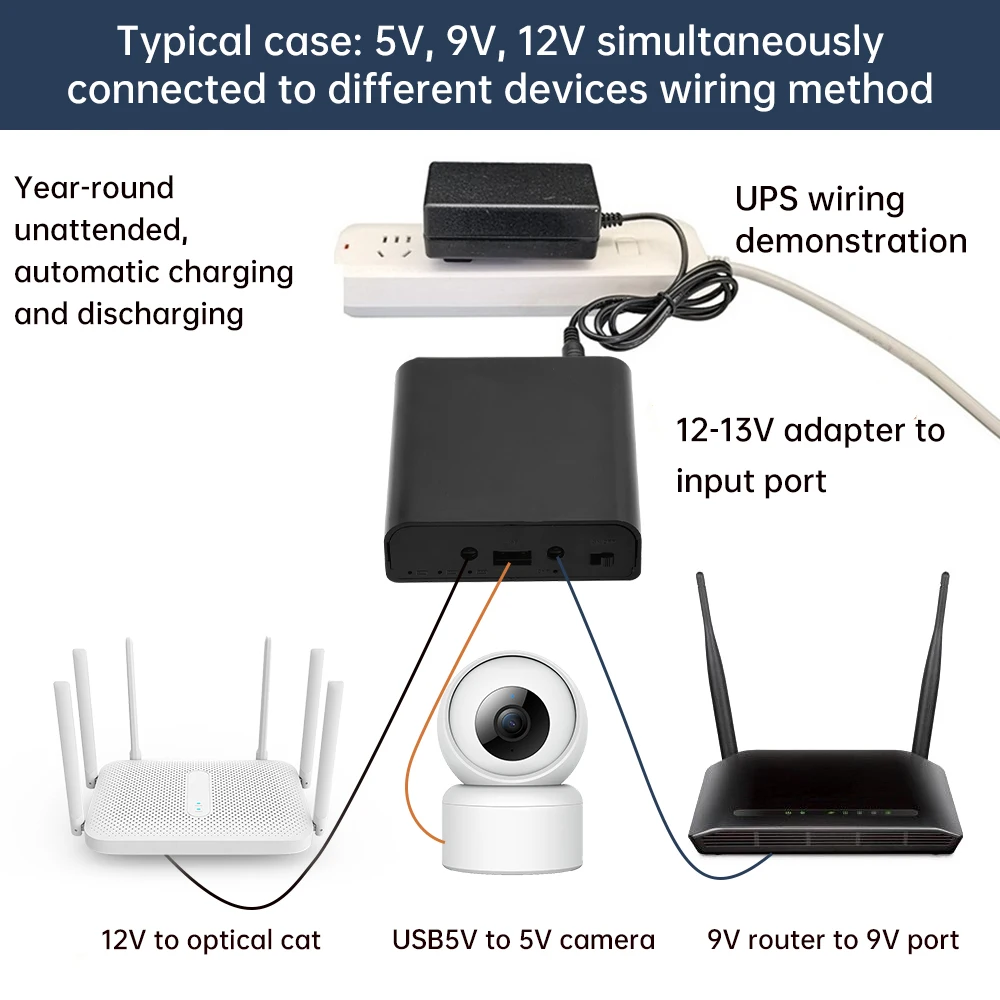 3.Admite voltajes comunes de 5 V, 9 V y 12 V para dispositivos como módems ópticos, enrutadores y cámaras de vigilancia.