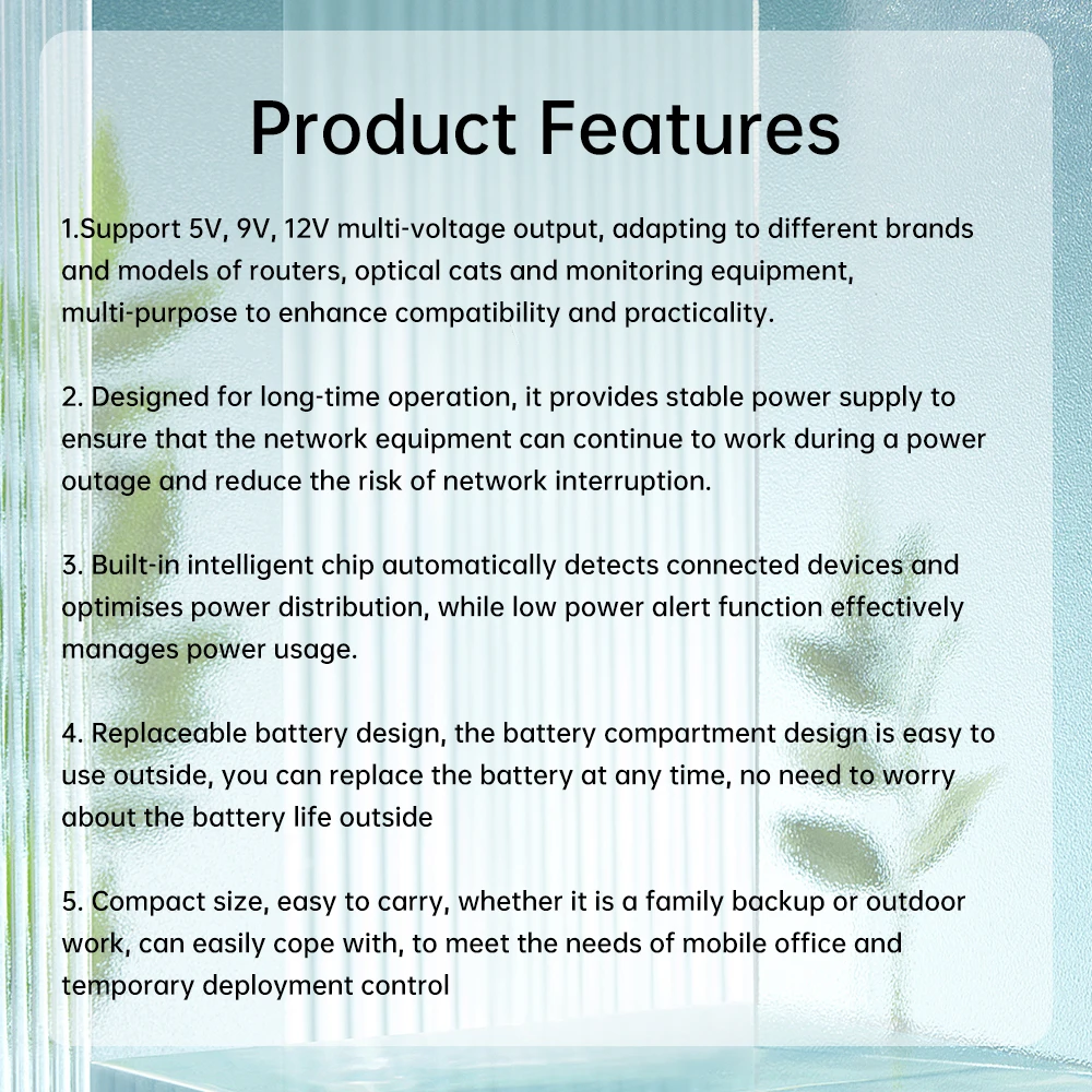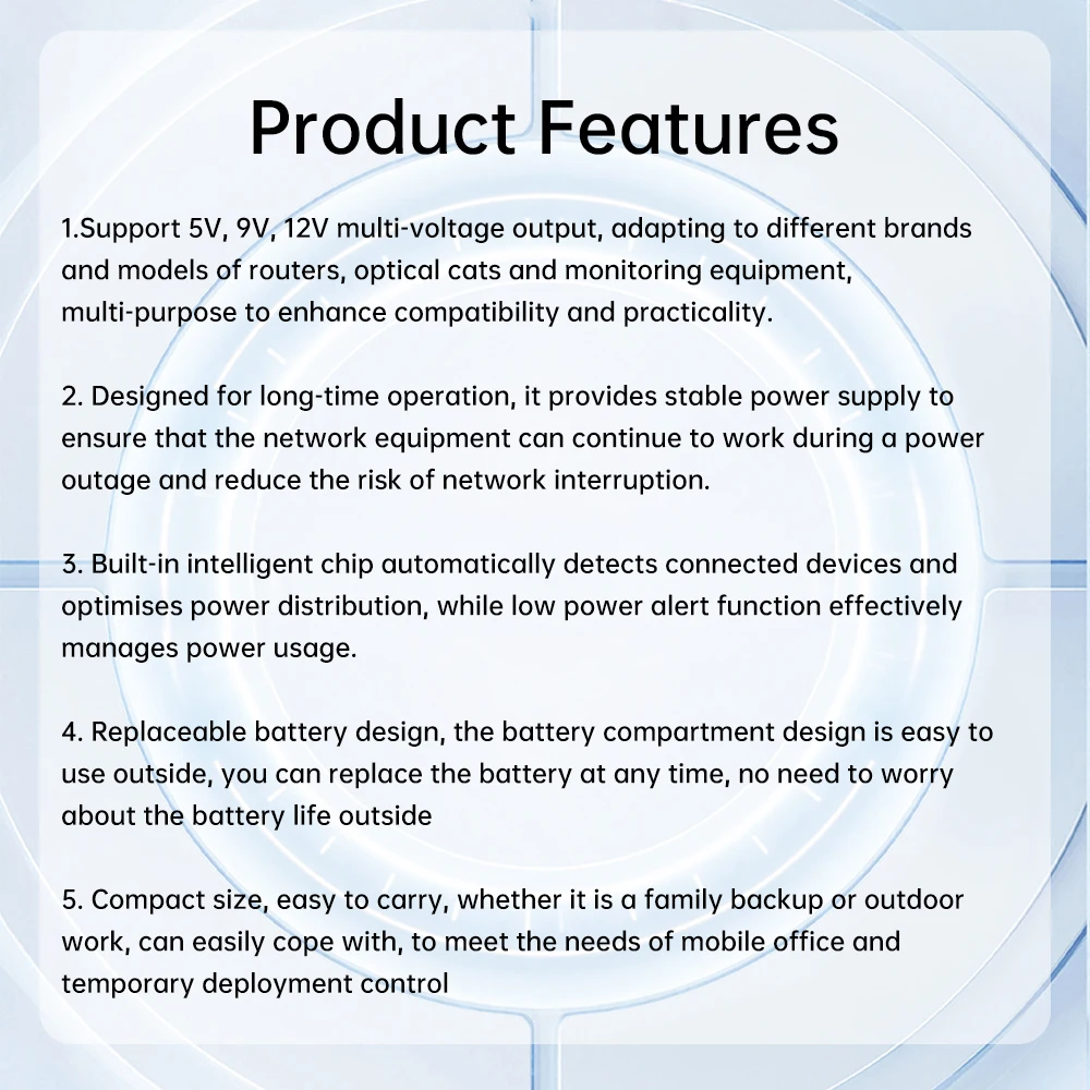 1.Admite múltiples salidas de voltaje de 5 V, 9 V y 12 V, compatible con enrutadores, módems ópticos y dispositivos de monitoreo de diferentes marcas y modelos, con una máquina para múltiples propósitos, lo que mejora la compatibilidad y la practicidad.
