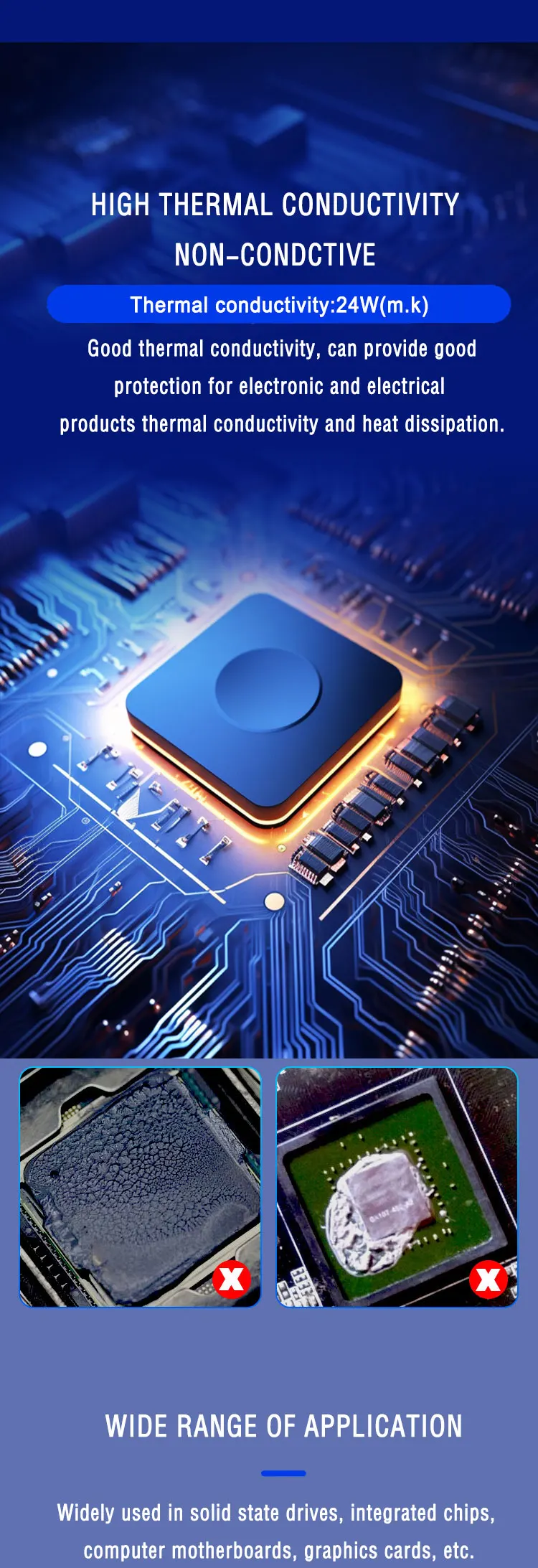 4. It can be used for heating elements such as CPU, GPU, graphics card, memory, mining machine, SSD solid state drive, notebook computer, game equipment, LED, server, household appliances, radiator, capacitor and resistor.