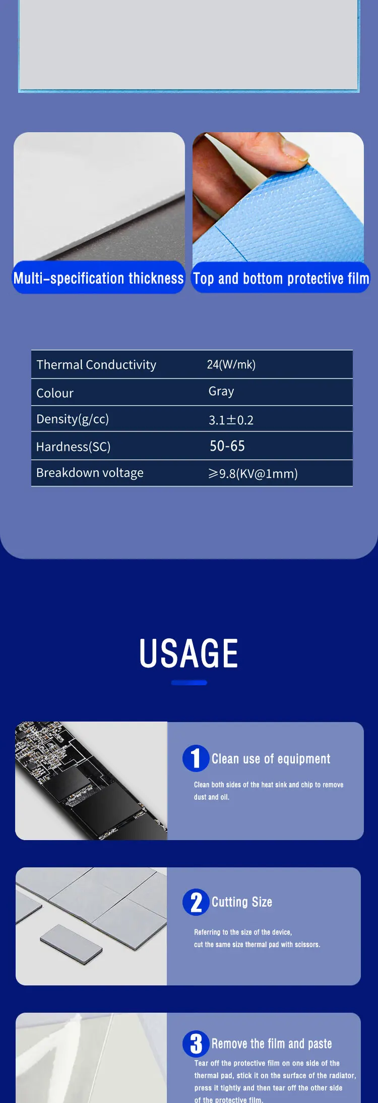 3: The thermal pad is soft. The thickness needs to be increased by 0.5-1.0mm in the calculation. Fits tightly after installation squeeze. Better heat dissipation.