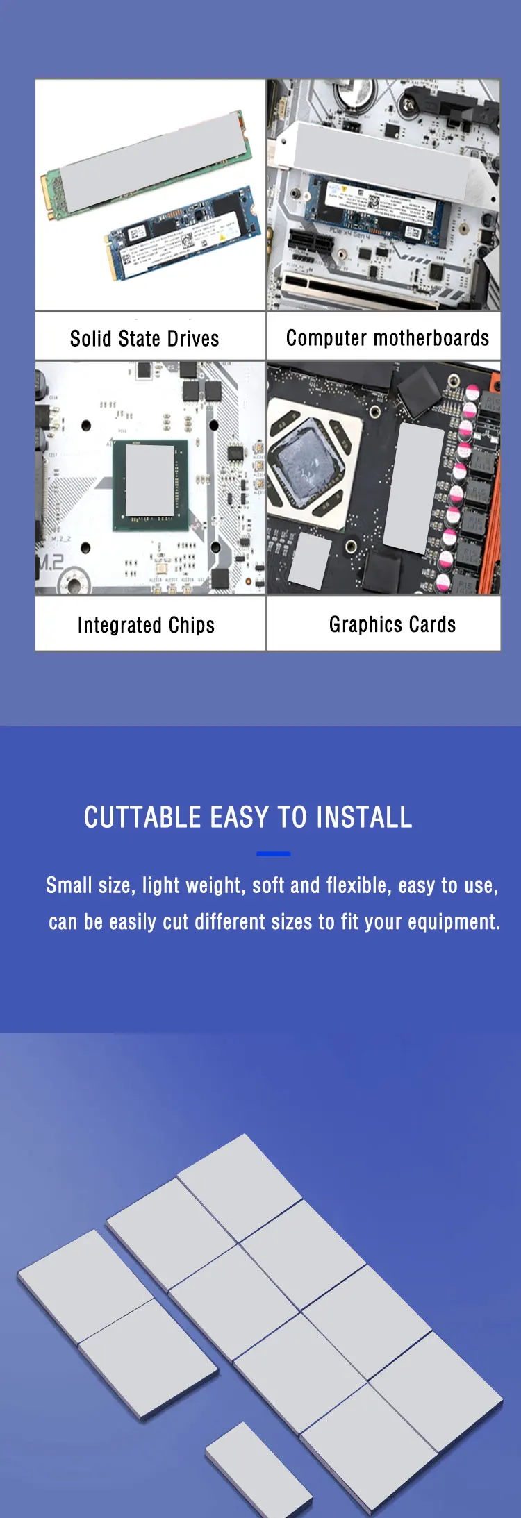 La conductividad térmica es la misma para cada espesor.Las almohadillas térmicas se pueden adquirir en varios espesores y tamaños.Los usuarios también pueden cortarlos al tamaño deseado.