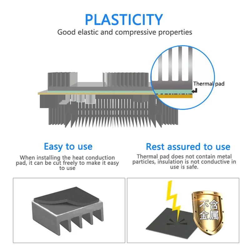 3: La almohadilla térmica es suave. El grosor debe aumentarse en 0,5-1,0mm en el cálculo. Se ajusta bien después de apretar la instalación. Mejor disipación del calor.