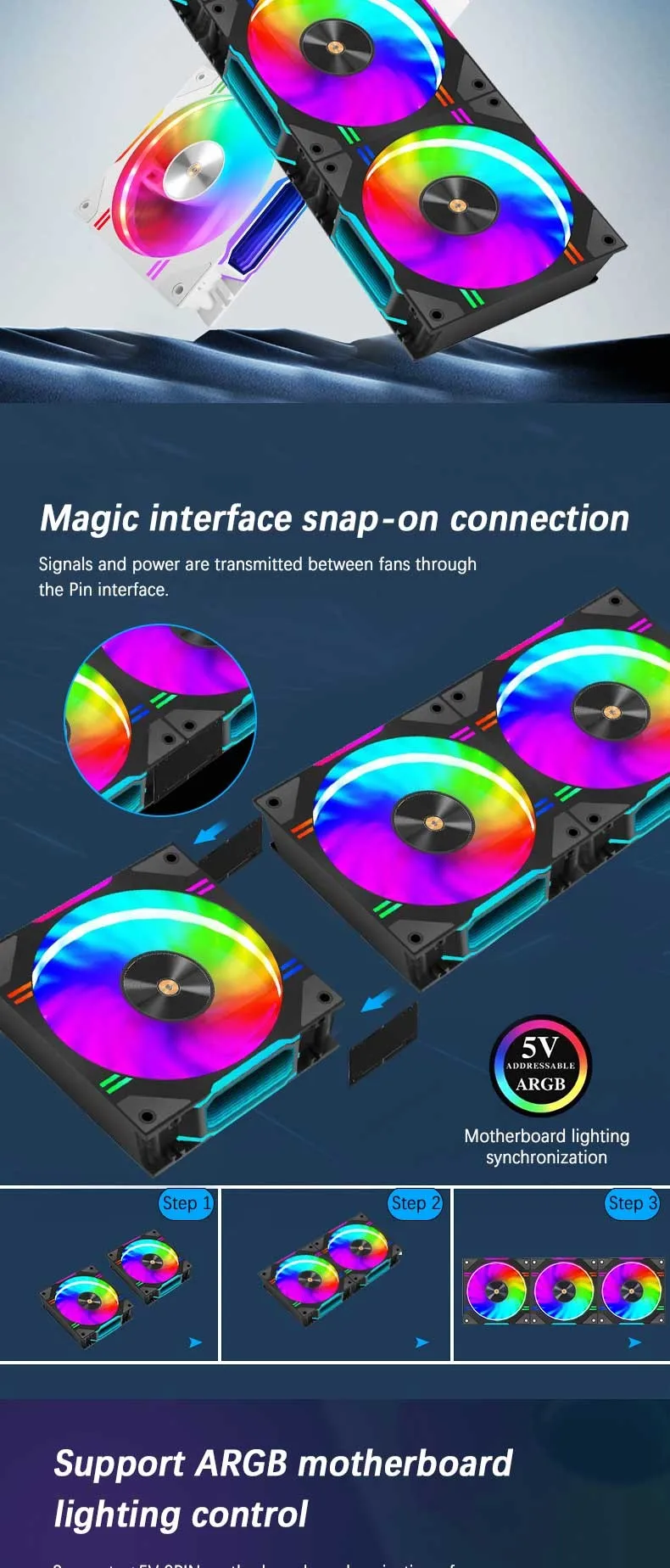 El ventilador está conectado mediante un clip y aún necesita ser alimentado por cables: fuente de alimentación de iluminación de 5V 3PIN, fuente de alimentación PWM de 4 pines.Admite conexión en serie de ventiladores y sincronización de efectos de iluminación.