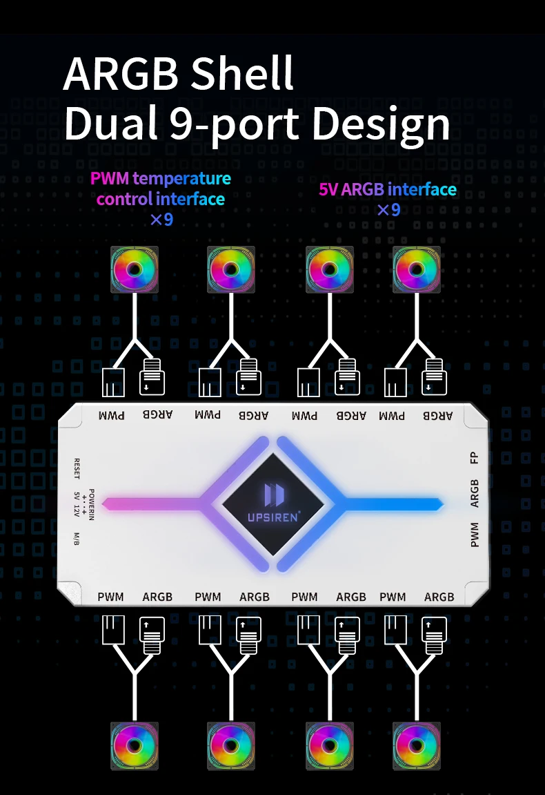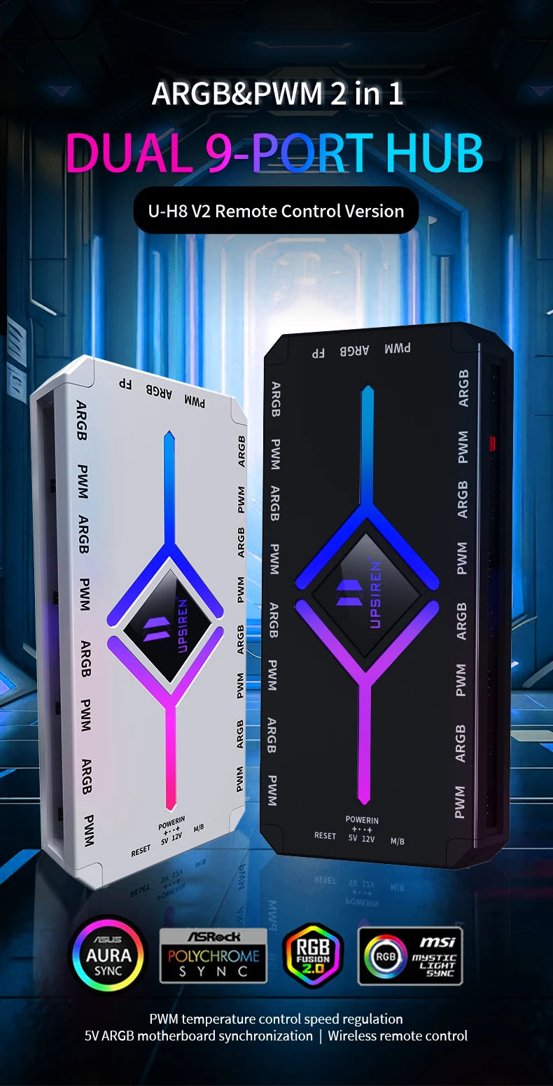 UPSIREN U-H8 V2 HUB de ventilador de chasis, fuente de alimentación SATA/succión magnética/ARGB/PWM 9 puertos 2 en 1/con controlador