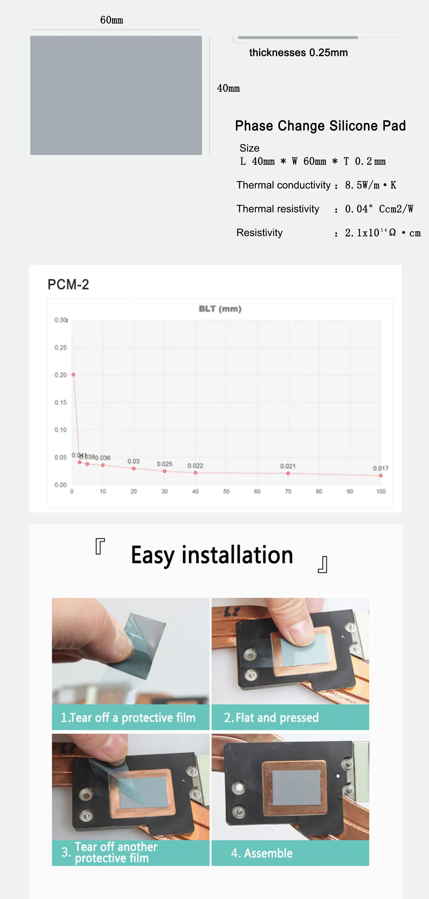 PCM-2, based on a novel polymer PCM system, exhibits excellent interface wetability during typical operating temperature ranges, resulting in extremely low surface contact resistance. Since PCM-2 comes only in 0.2mm (thicker versions are under development) you need to be sure that this thickness is compatible and suitable for the flatness of your package.