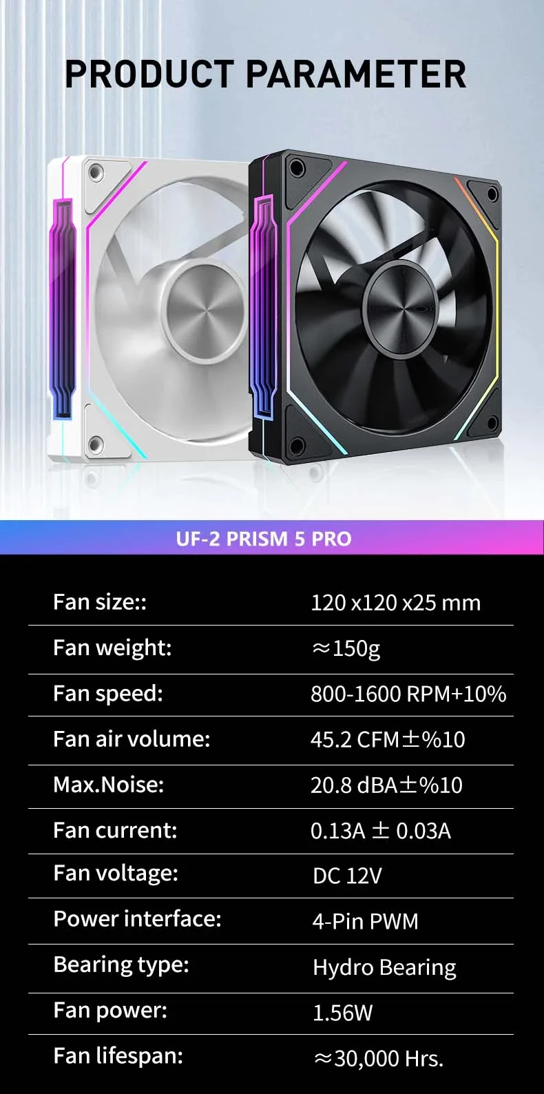 UPSIREN UF-2 PRISM 5 PRO ventilador para chasis de ordenador 12cm ARGB 4 pines PWM ventilador de refrigeración silencioso 12V gran volumen de aire 45.2CFM/800-1800RPM