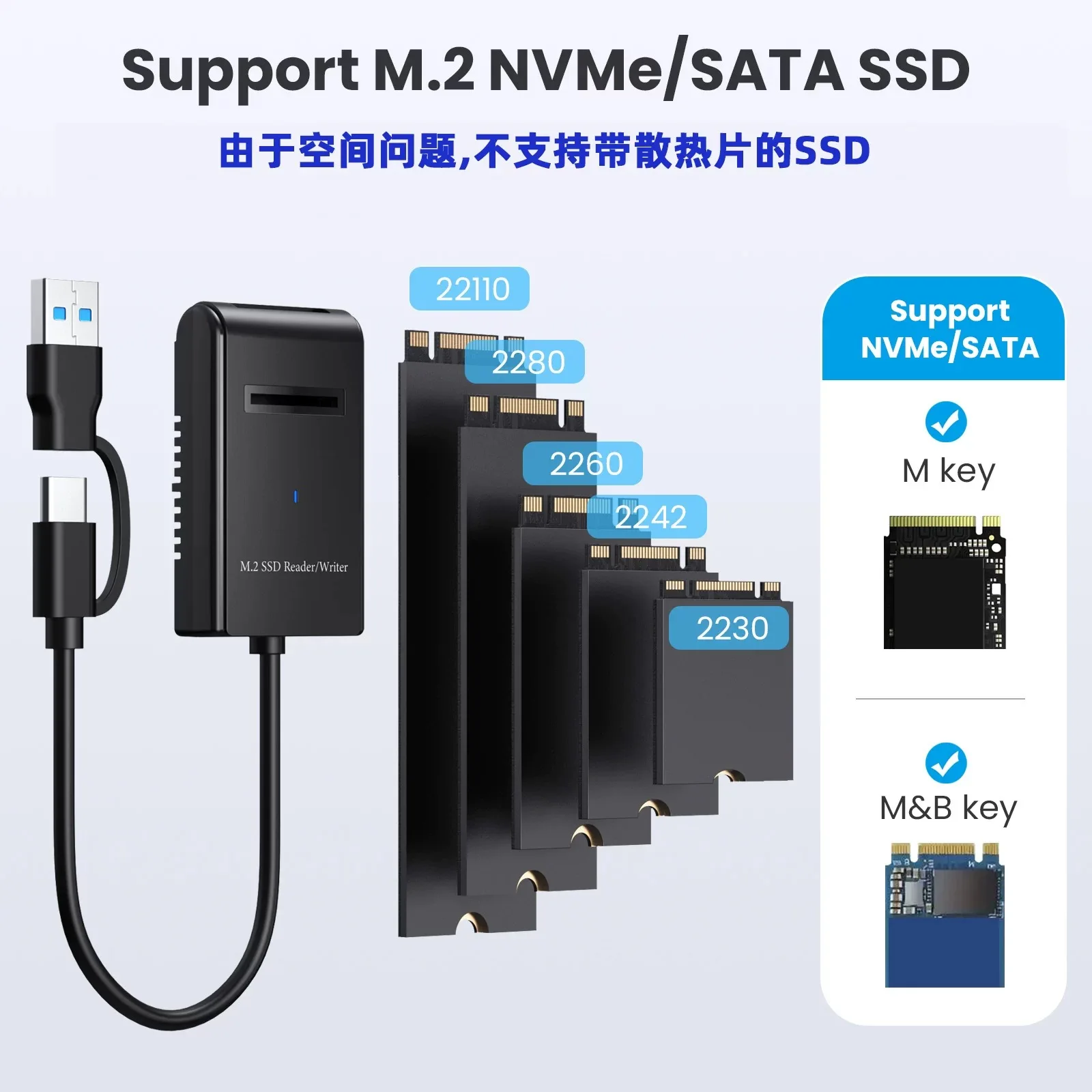 Esta carcasa SSD USB3.0 a M.2 solo para conectores NVMe PCIE M-Key/B+M M.2 SSD.Aplicable a tamaños de controladores de estado sólido 2242 / 2260 / 2280.