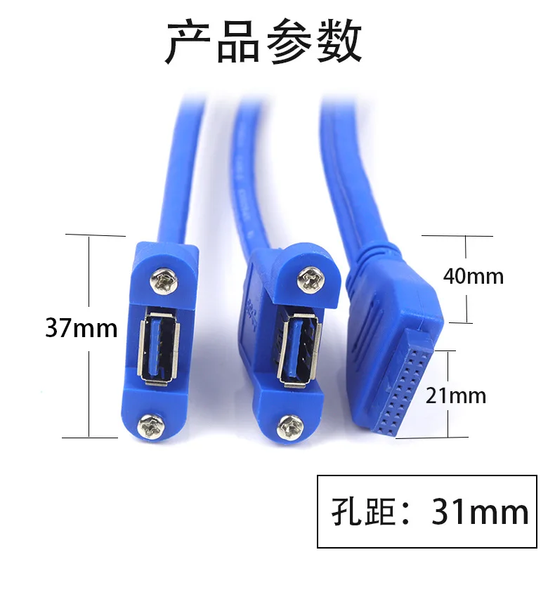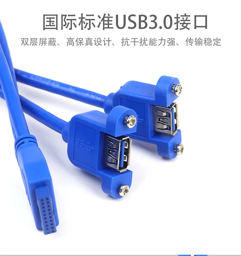 USB 3.0 Dual Two Port Female Screw Mount Type to Motherboard 20pin Header cable 20cmWith this cable, you can directly board 20pin socket (such as latest series of motherboard P7P55 / USB3 ), converted to 2 usb3.0 socket! Very easy to useUSB3.0 data cable connected to the front panel of USB3.0!There is 2 screw holes at USB 3.0 Female end.