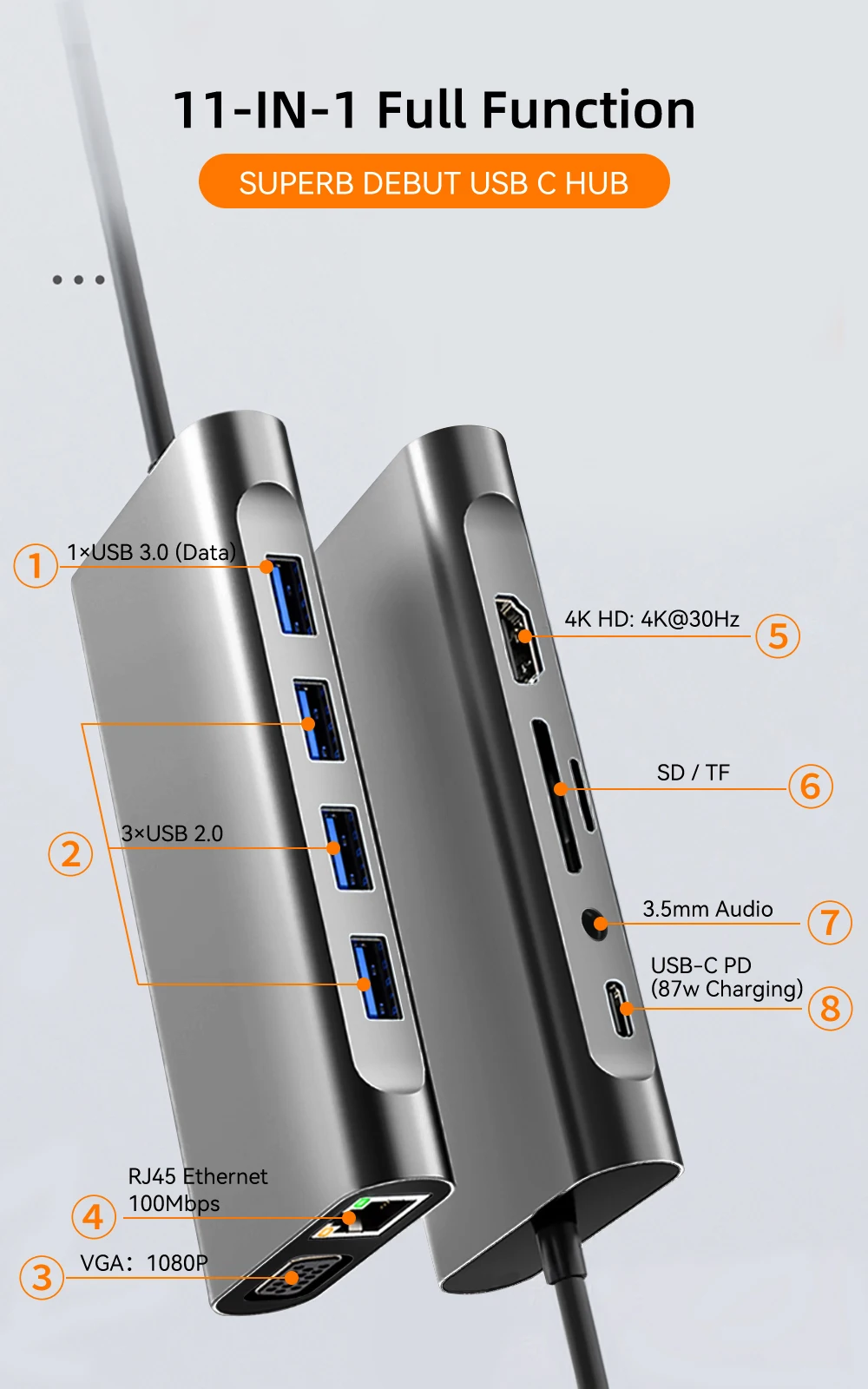 (4)11 en 1Tipo C: HDMI 4K@30HZ*1+VGA 1080P*1+USB 3.0*1+USB 2.0*3+PD 87W*1+100M RJ 45*1+TF*1+SD*1+Audio de 3,5 MM*1
