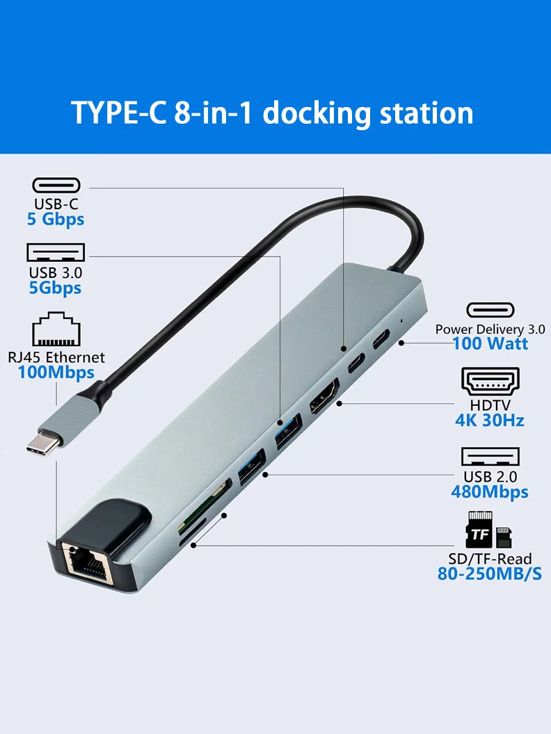 Comprar USB C tipo C 8 en 1 HUB con lector de tarjetas RJ45 SD/TF USB3.0 2,0 HD PD carga rápida para teléfono Dex modo de escritorio portátil