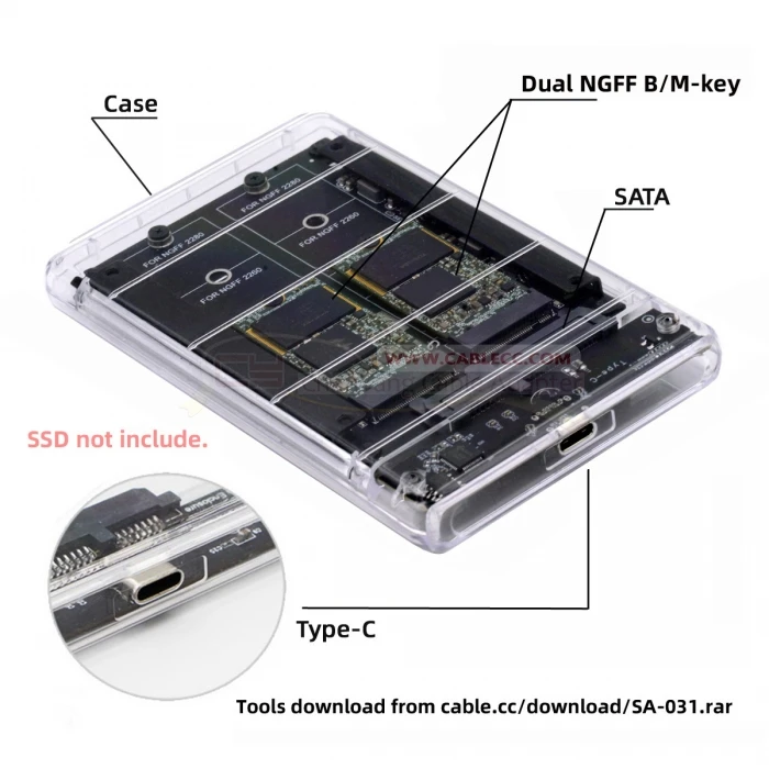 Dual NGFF B + M-Key M.2 Tarjeta SSD JBOD Raid0 Span Bridge a USB3.0 Tipo-C Caja combinada SATA de 2,5 pulgadas de