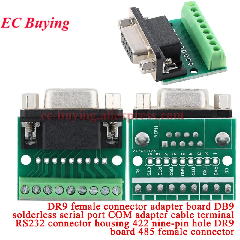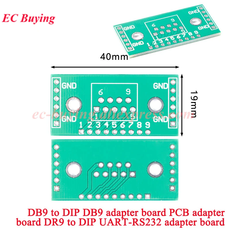 Convierta DR9 (macho o hembra) en una sola fila de conector recto de 2,54 mm DIP 9 pines: cada lado de la placa está equipado con un espacio de 6 pines de 2,54 mm, lo cual es conveniente para fijar la placa a una placa universal u otra placa de experimento.