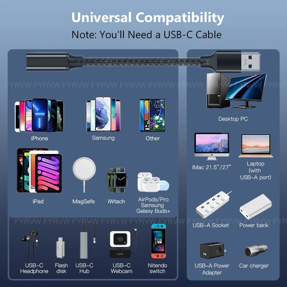 【Adaptador USB A a C】- Este es un adaptador de cable USB C hembra a USB A macho diseñado para transferencia de datos o carga.Con este cable de extensión conectado a un puerto USB estándar disponible, sus dispositivos USB pueden convertirse en una plataforma habilitada para USB-C.