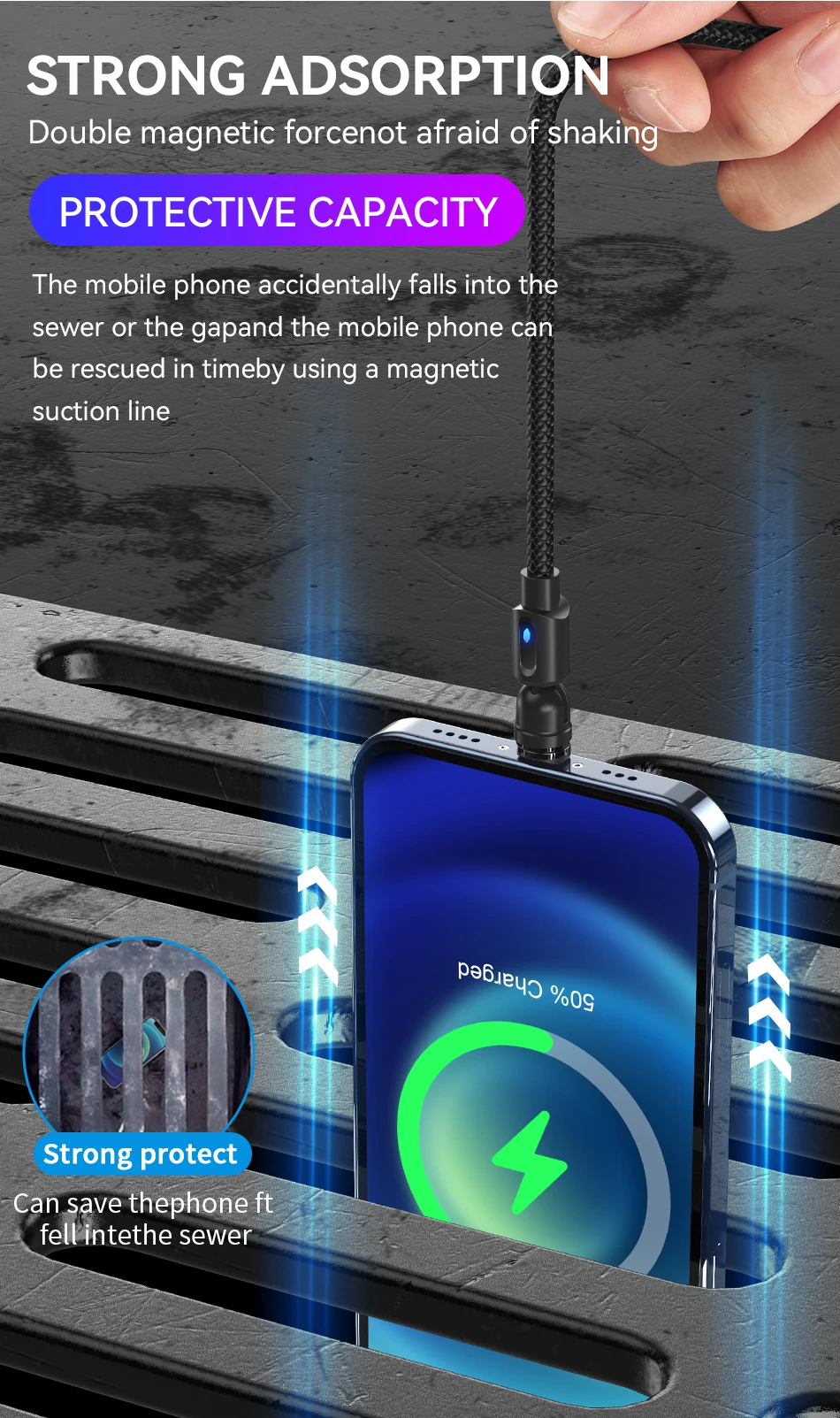 Diseño de luz LED: La pantalla LED interna del cable USB magnético muestra la iluminación azul cuando se está cargando o en modo de espera. Diseño LED especial, incluso en la oscuridad, aún puede encontrar su teléfono y cargarlo fácilmente. Puede usar una mano para operar este cable de carga del teléfono para encender/apagar la carga, es conveniente y seguro mientras conduce.
