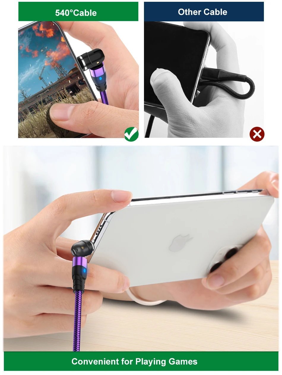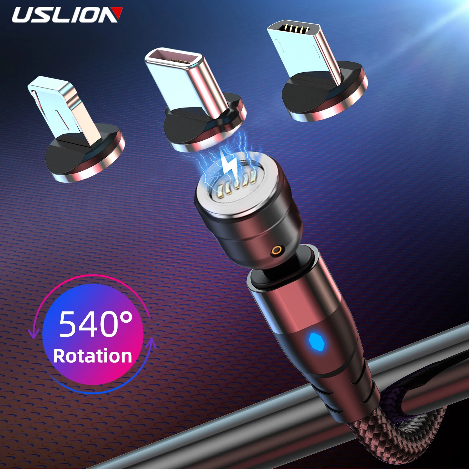Comprar USLION-Cable magnético de rotación 540, carga rápida Micro USB tipo C 3A para iPhone 11, 12 Pro Max, 8 Plus, XR, Samsung y Xiaomi