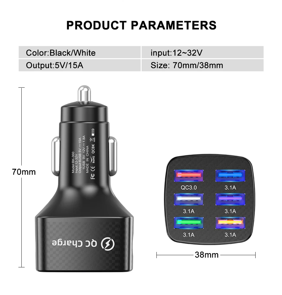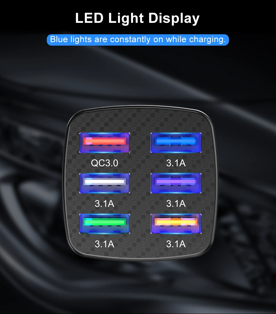 【 Cargador de coche para teléfono móvil de 6 puertos compatible con carga rápida QC 3,0 y 3.1A 】