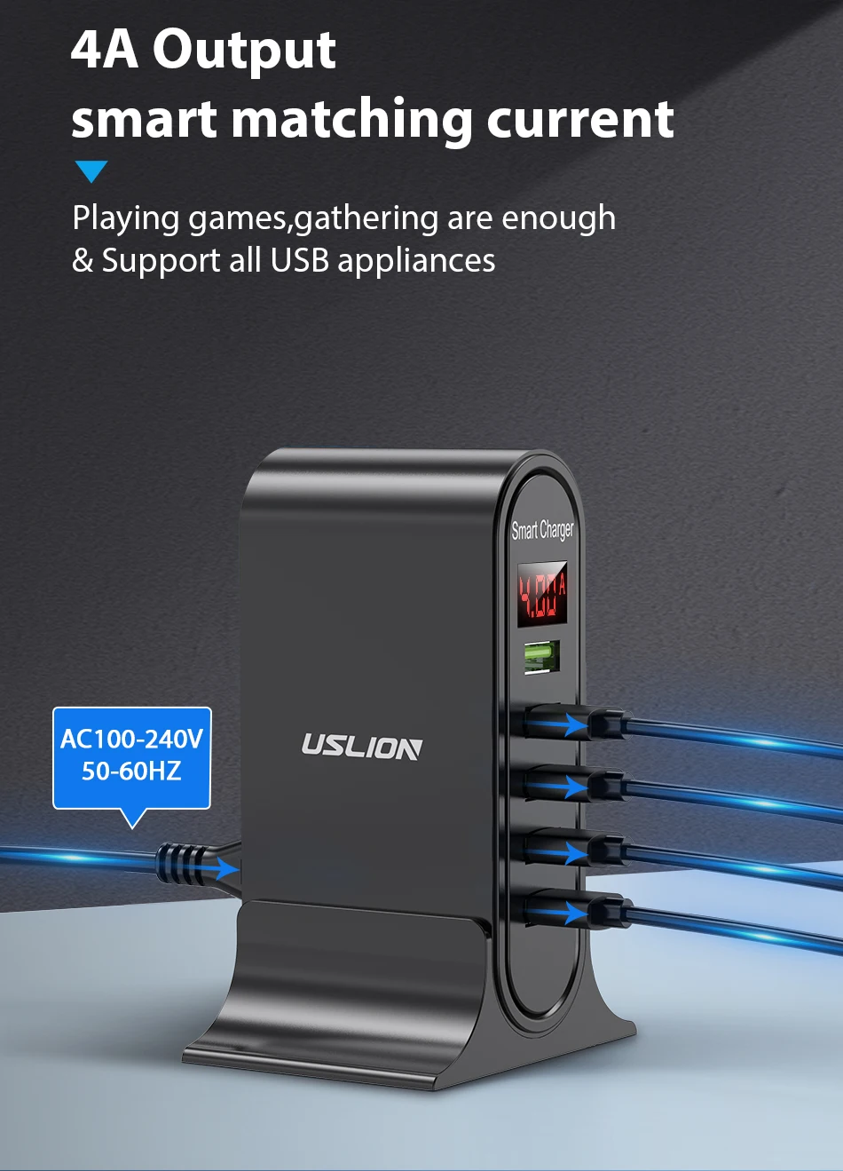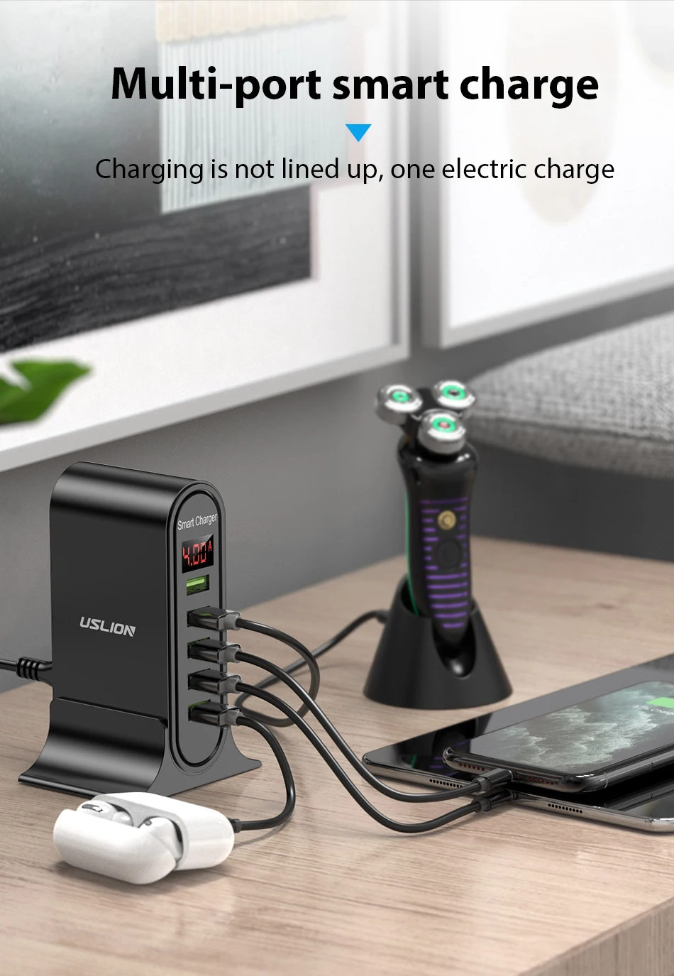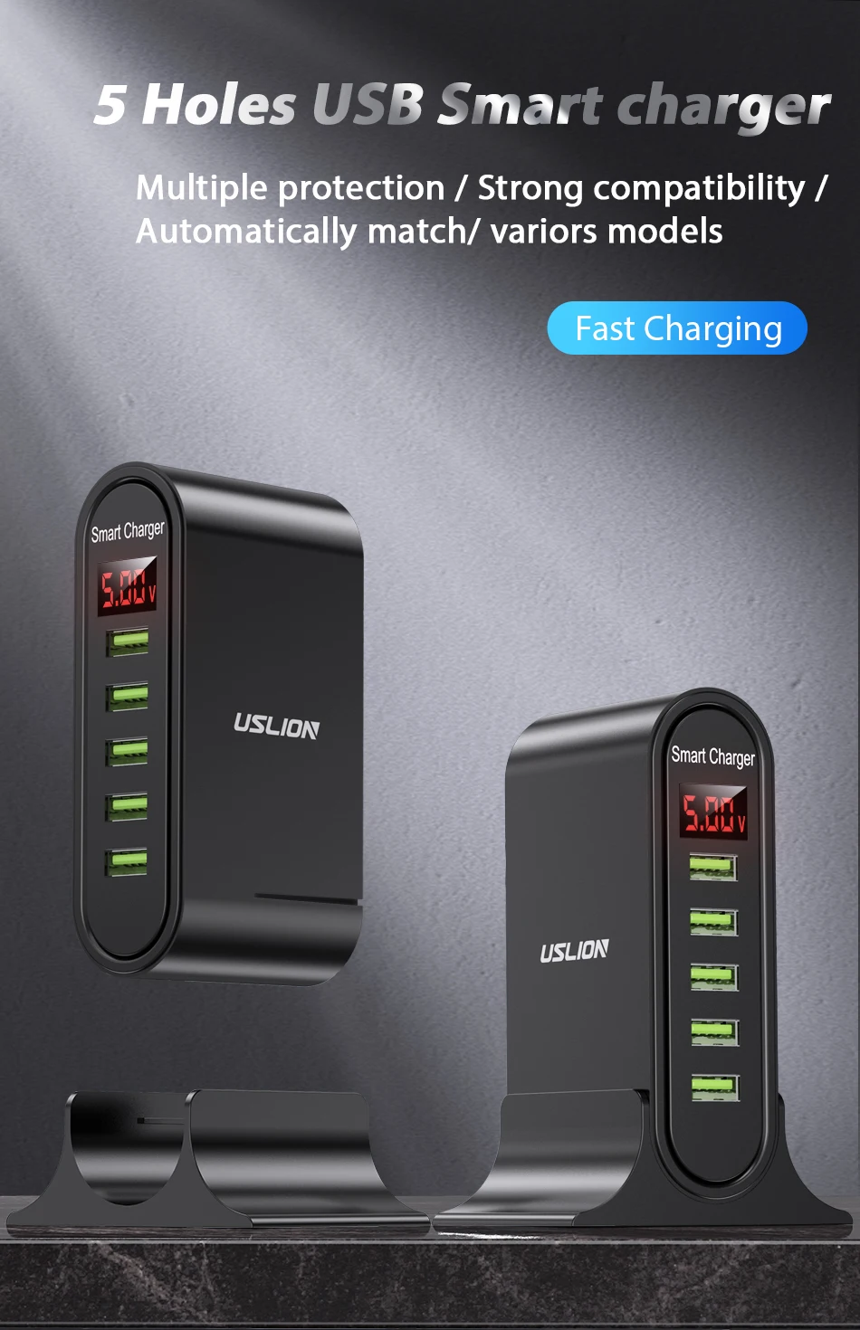 USLION-cargador USB de 5 puertos para Xiaomi, estación de carga multiusb con pantalla LED, Teléfono Universal, escritorio, pared, hogar, enchufe UE, EE. UU., Reino Unido