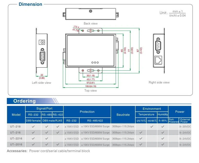 Comprar UT-218 RS-232 a RS-485/RS-422 Convertidor de interfaz de aislamiento fotoeléctrico 2.5KVrms iluminación mejorada, protección ESD contra sobretensiones