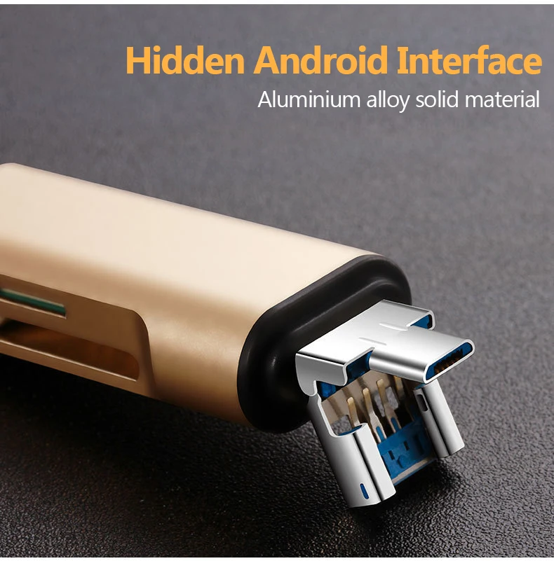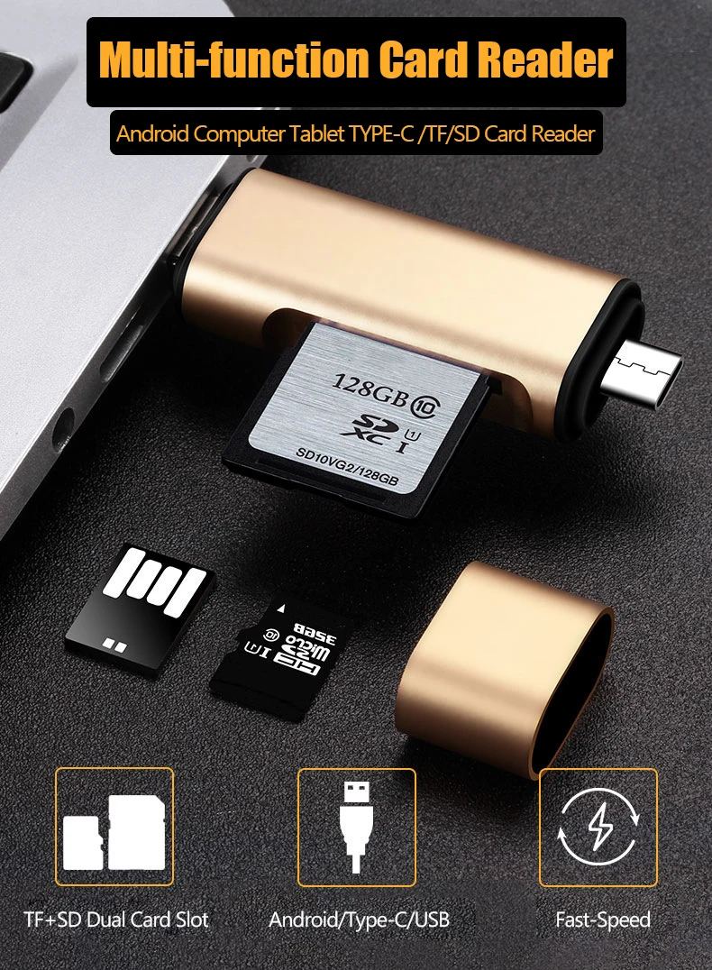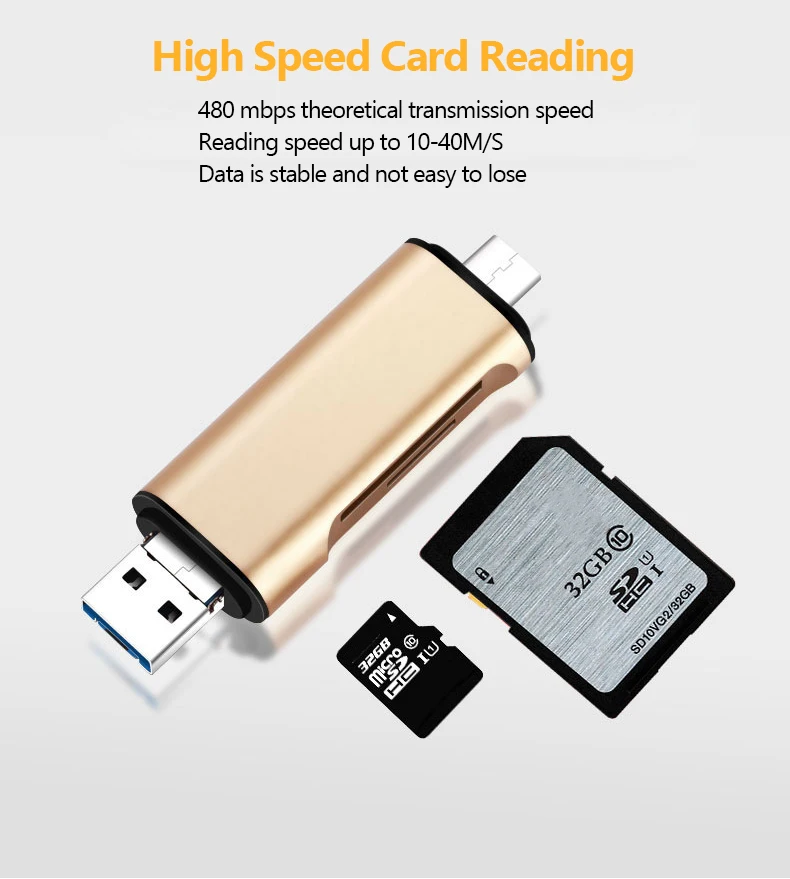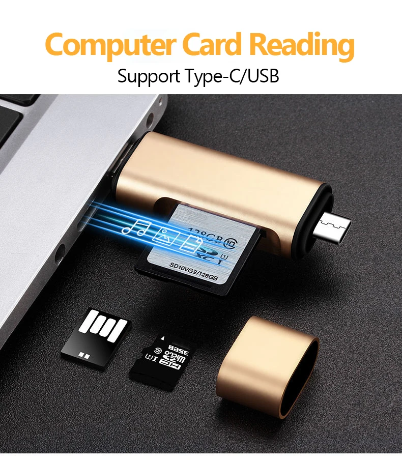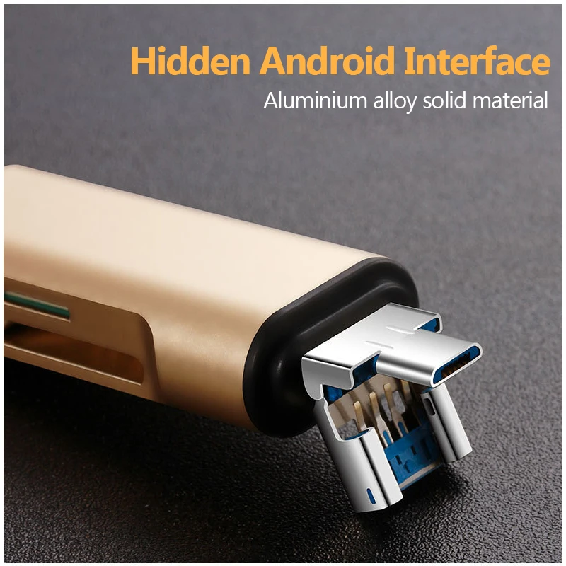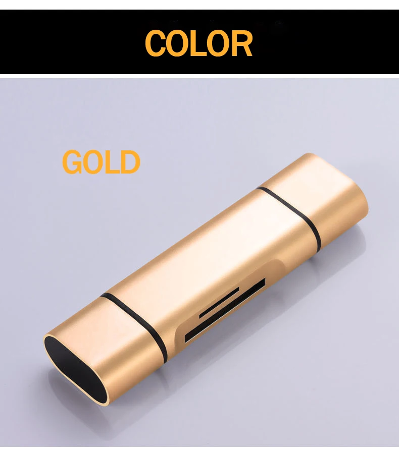 Especificación: Color: plata, oro Interfaz: Tipo-c + MicroUSB + USB3.0 tres en uno Material: aleación de aluminio + ABS Función: transmisión de datos de tarjeta de memoria SD y TF/interfaz USB3.0 para interfaz tipo C/interfaz Micro USB Tamaño del producto: 80mm * 20mm * 11mm
