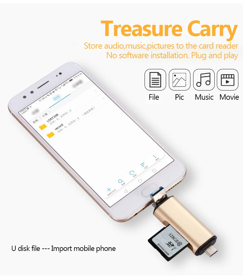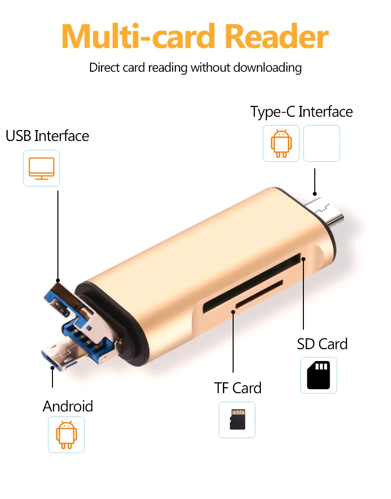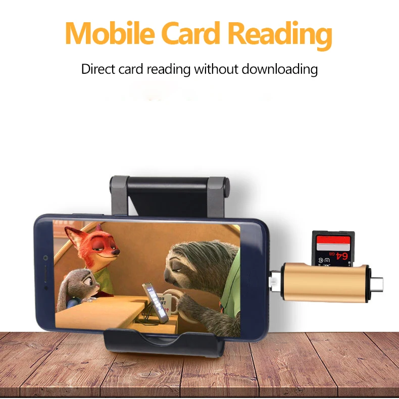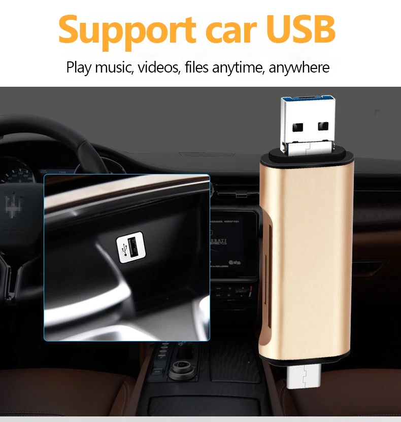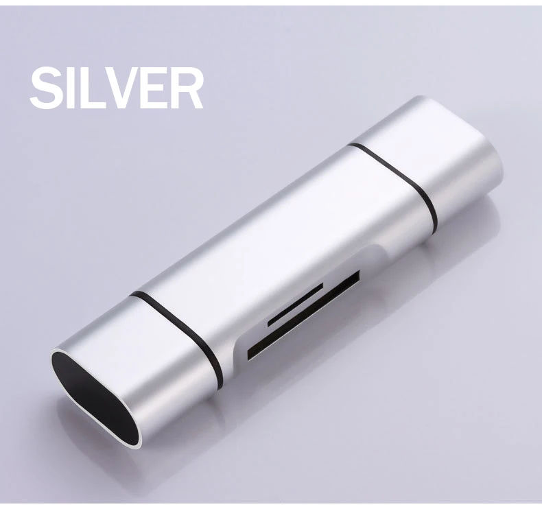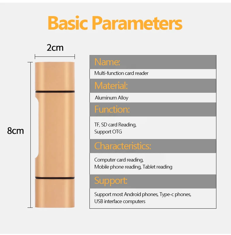 Especificación: Color: plata, oro Interfaz: Tipo-c + MicroUSB + USB3.0 tres en uno Material: aleación de aluminio + ABS Función: transmisión de datos de tarjeta de memoria SD y TF/interfaz USB3.0 para interfaz tipo C/interfaz Micro USB Tamaño del producto: 80mm * 20mm * 11mm