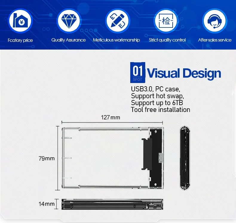 1. Soporta todos los estándar 7mm/9,5mm 2,5 pulgadas SATA I/II/III HDD y SSD hasta 6TB(Max)