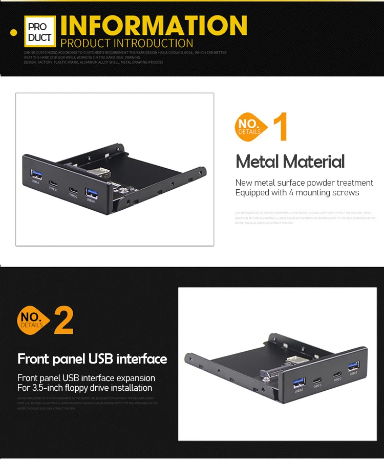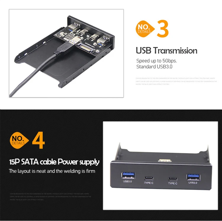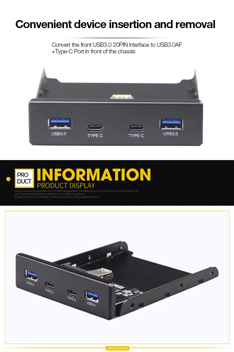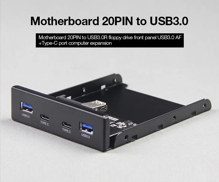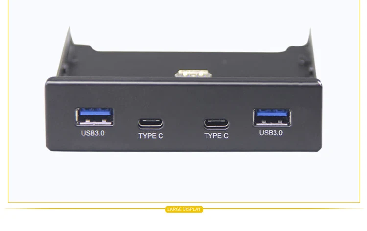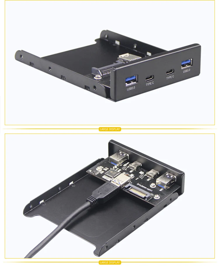 1. Especificaciones: Puerto: 2 puertos USB tipo C + 2 puertos USB tipo A 2. Velocidad de transferencia de datos: en línea con USB 3. Gen1 1 (5Gbps) y USB 3,0 3. La misma velocidad de transmisión de datos es adecuada: 3,5 pulgadas de espacio abierto. 4. Longitud del cable: 50cm compatible con Windows XP / Vista / 7/8/8,1 plug and play back hot swap, compatible con USB 1,1, USB 2,0, USB 3,0 Tenga en cuenta que se requiere un conector USB de 20 pines en la placa base