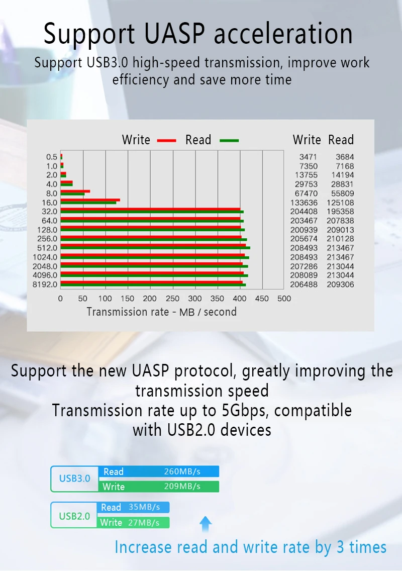4. It is 70% faster than the traditional USB 3.0 using UASP transmission protocol; it can speed up the read and write speed of the SSD hard disk.