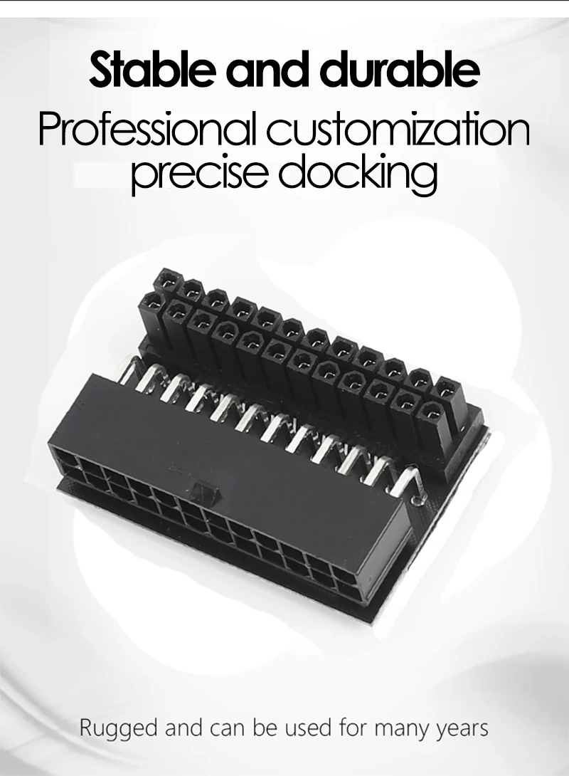 Ventajas: Interfaz de conector de alimentación ATX dedicada investigada y desarrollada profesionalmente, resistente y Duradera; el PCBA grueso puede transportar una corriente excesiva; la soldadura SMT respetuosa con el medio ambiente sin plomo es firme; el EVA grueso aislante no conductor se pega en la parte posterior para proteger las juntas de soldadura y garantizar la seguridad del cableado en el chasis.