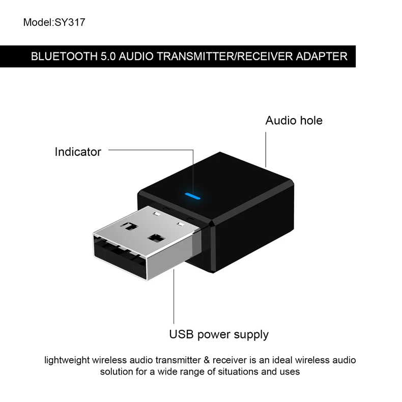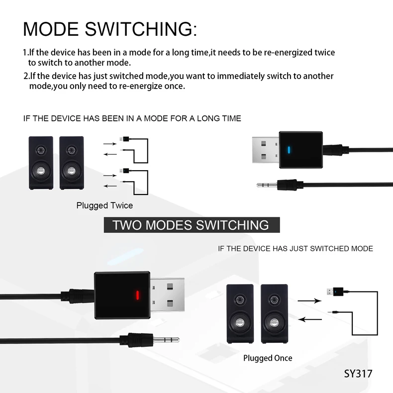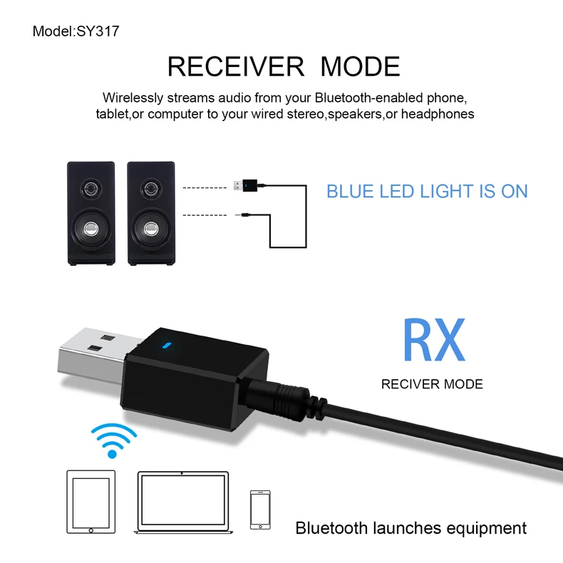 A) Cómo usar el modo de recepción: El LED azul parpadea para indicar que ha cambiado al modo de recepción. El USB del producto se utiliza para la fuente de alimentación, el voltaje de la fuente de alimentación es de 5V y se puede conectar a cualquier interfaz USB de salida de 5V, como un cargador de teléfono móvil de 5V. Nombre de emparejamiento: SY317, encuentra el emparejamiento SY317 en la Configuración Bluetooth del teléfono móvil. La luz azul parpadea durante el proceso de emparejamiento. Después de que el emparejamiento sea exitoso, la luz azul dejará de parpadear y se mantendrá encendida. Al mismo tiempo, utilice un cable de audio 3,5 para conectar este producto a auriculares con cable, altavoces normales, equipos de sonido de coche y otros dispositivos sin Bluetooth. En este momento, el teléfono móvil reproduce la canción y la canción se puede transmitir de forma inalámbrica a estos dispositivos.