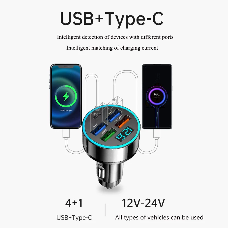 Utilizado para cargador de coche, teléfono móvil, enchufe de conversión de encendedor de cigarrillos, carga súper rápida de cinco agujeros, interfaz USB para coche 100/300/500W