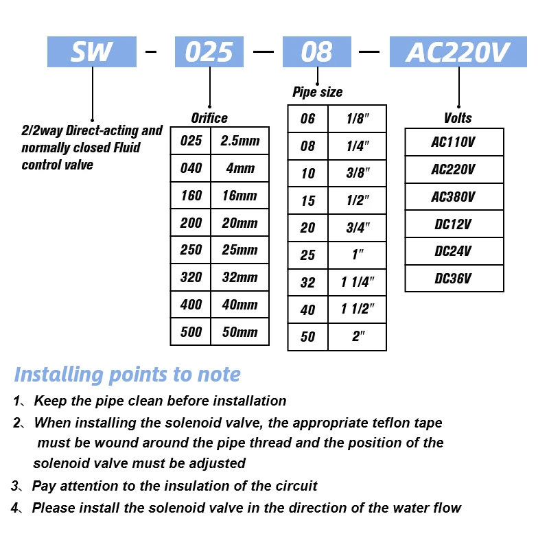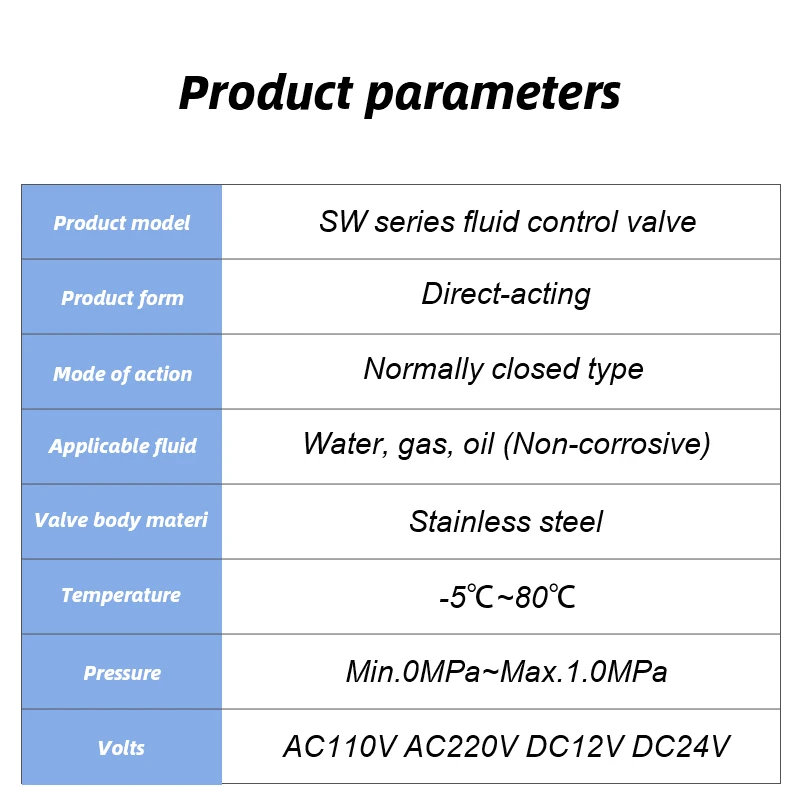 Válvula de agua normalmente cerrada de acción directa serie SW, válvula neumática de 1/4 ", 1/8", 1/2", 3/4 "AC220V DC24V para agua, aceite y aire